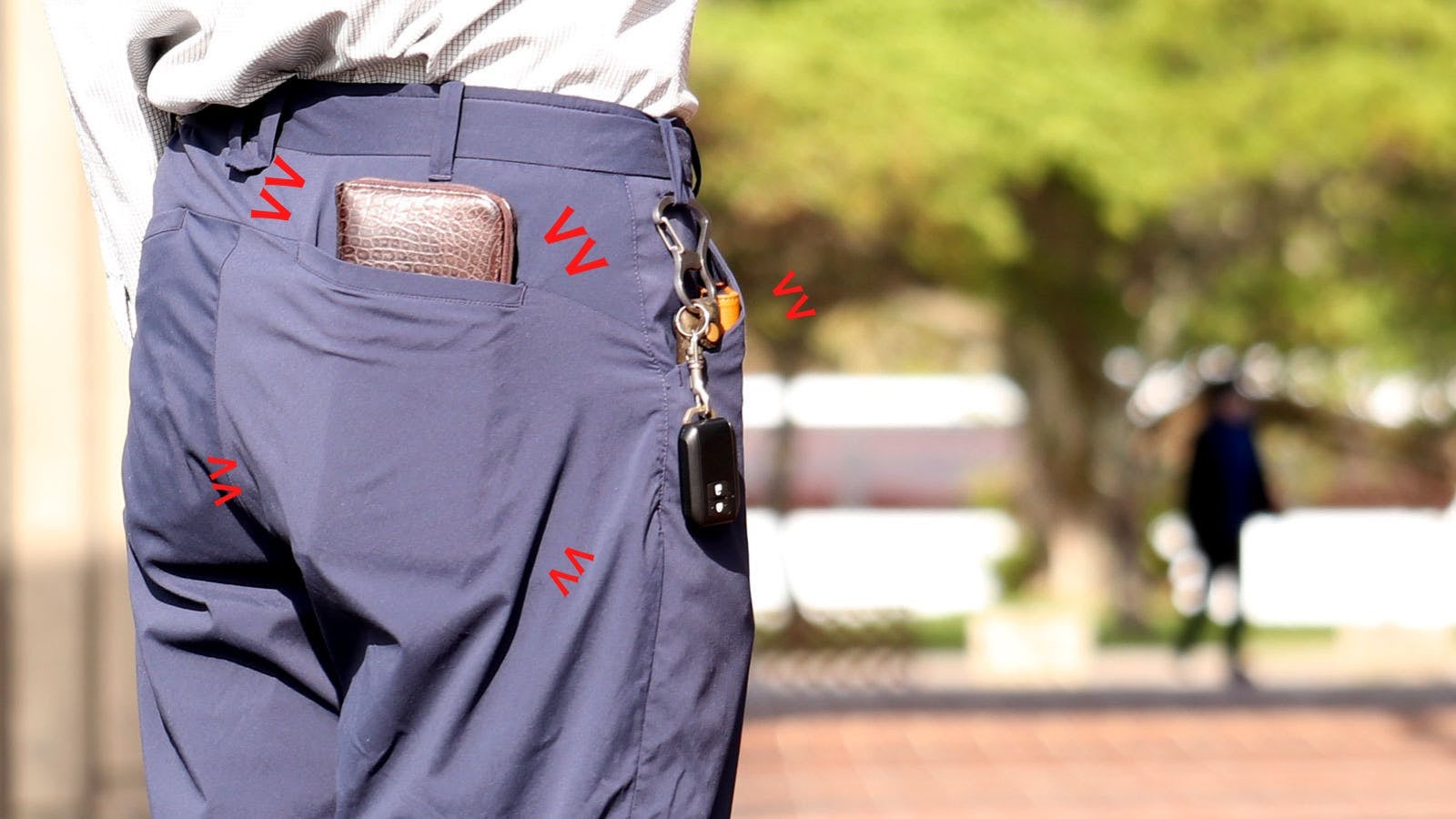 スマホや携帯、カギなど全部ポケットに入れると座った時にキツイ!歩きにくい!