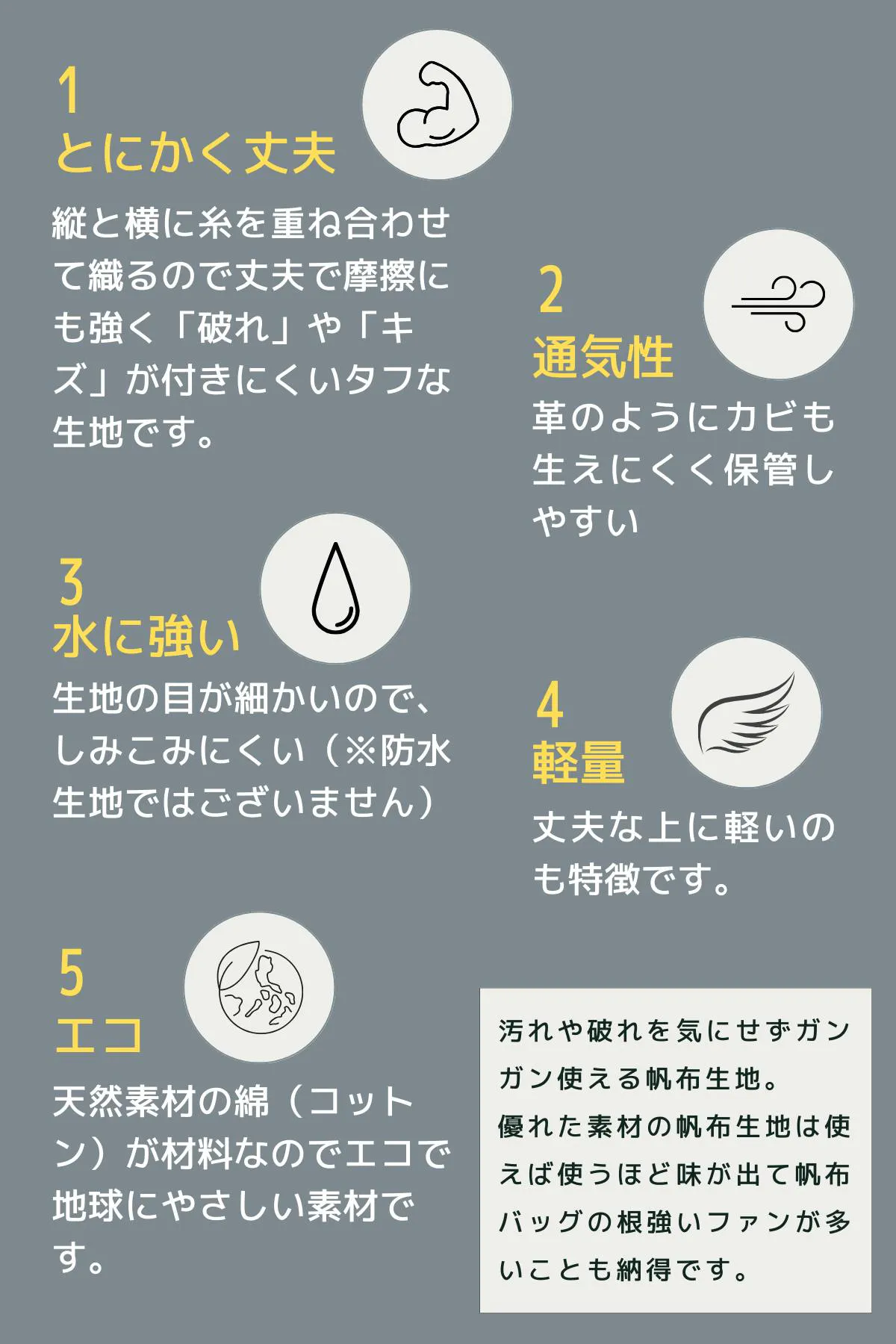 バッグに使用している帆布(はんぷ)生地 (英名:キャンバス)その特徴はすばらしく、