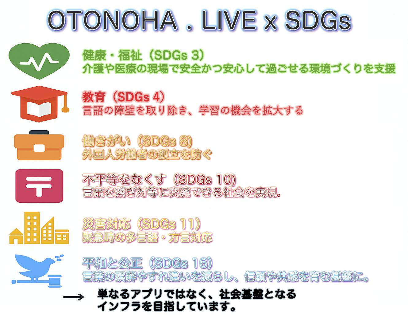 2025/10/09 06:43令和7年10月7日商標出願をいたしました。現在 特許出願準備中です。令和7年10月9日 6:30 現在Androidで音声が認識できないバグが発生しています。バグに伴い現在プログラム修正中です。iPhone Windows MacではSafari Chrome webブラウザーで修正後はhttps://otonoha.live でご利用可能になります。AndroidではChromeの仕様で音声が多言語化できませんのでウェブアプリとしてご利用が可能です。https://otonoha.live/android/ でご利用可能になります。お試し版体感を早急に進めています。ご迷惑おかけしております。少しお待ちください。 もっと見る