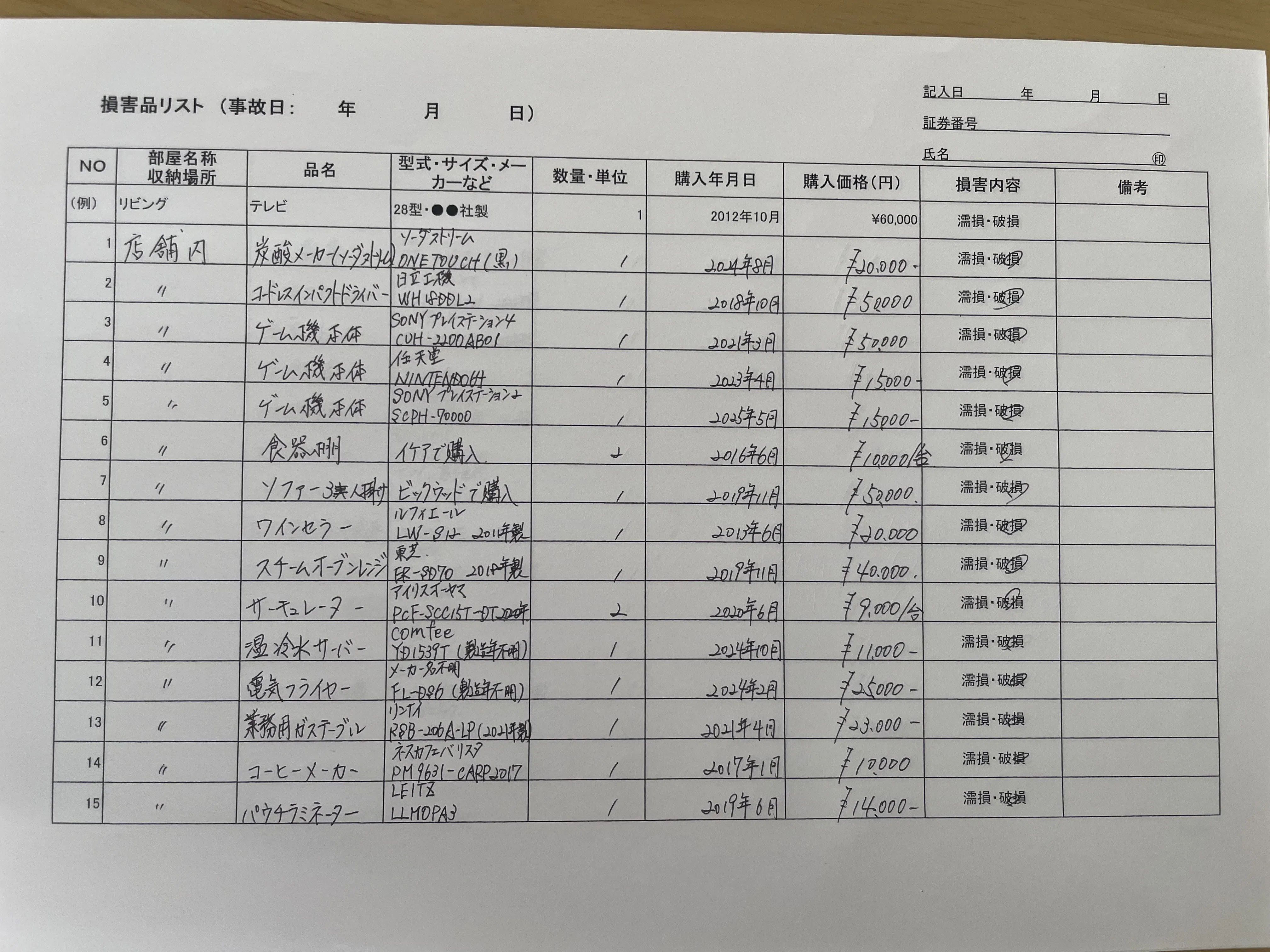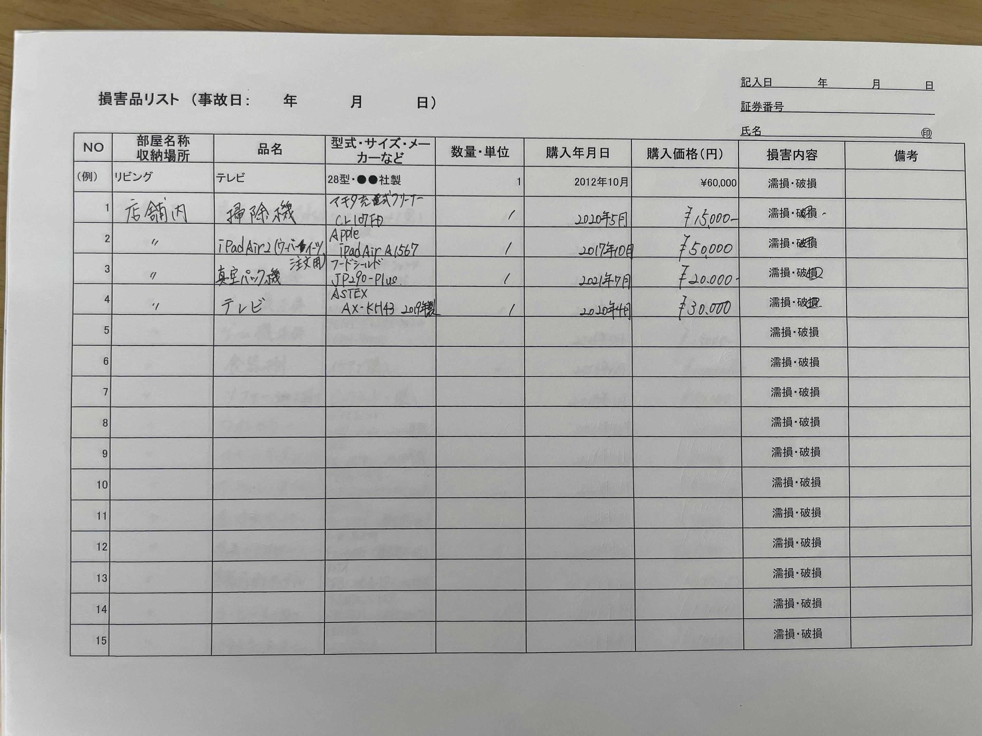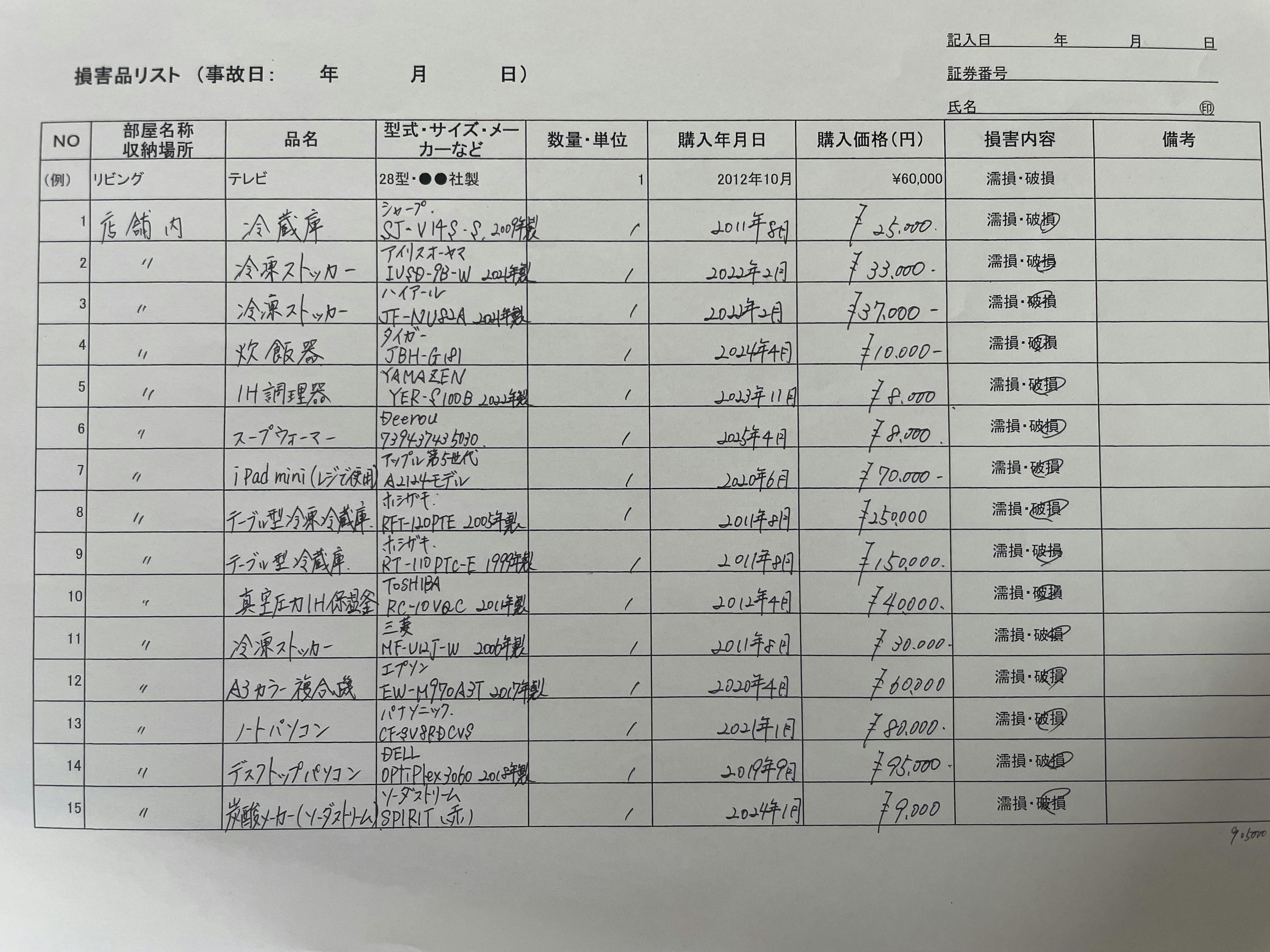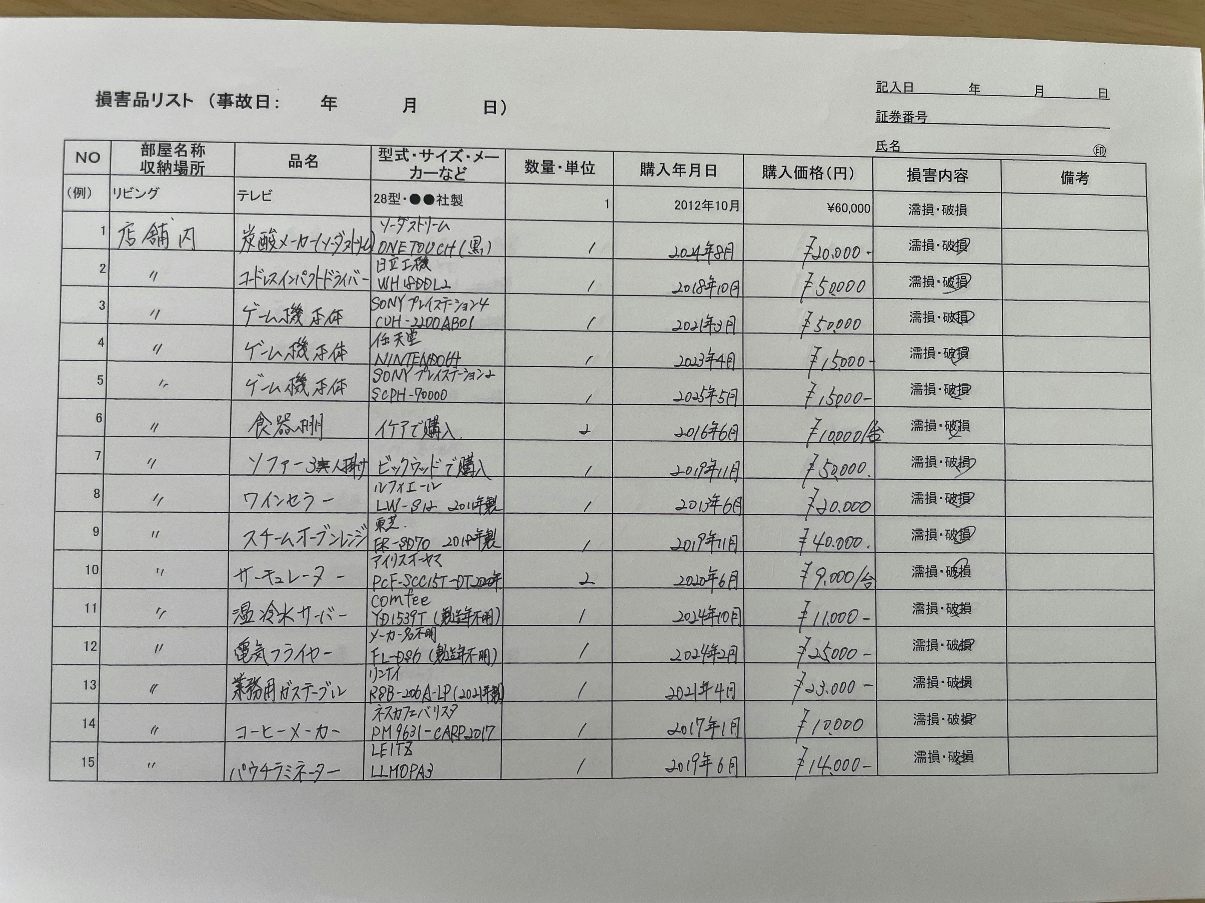 保険会社に提出した被害品一覧