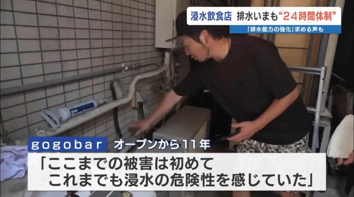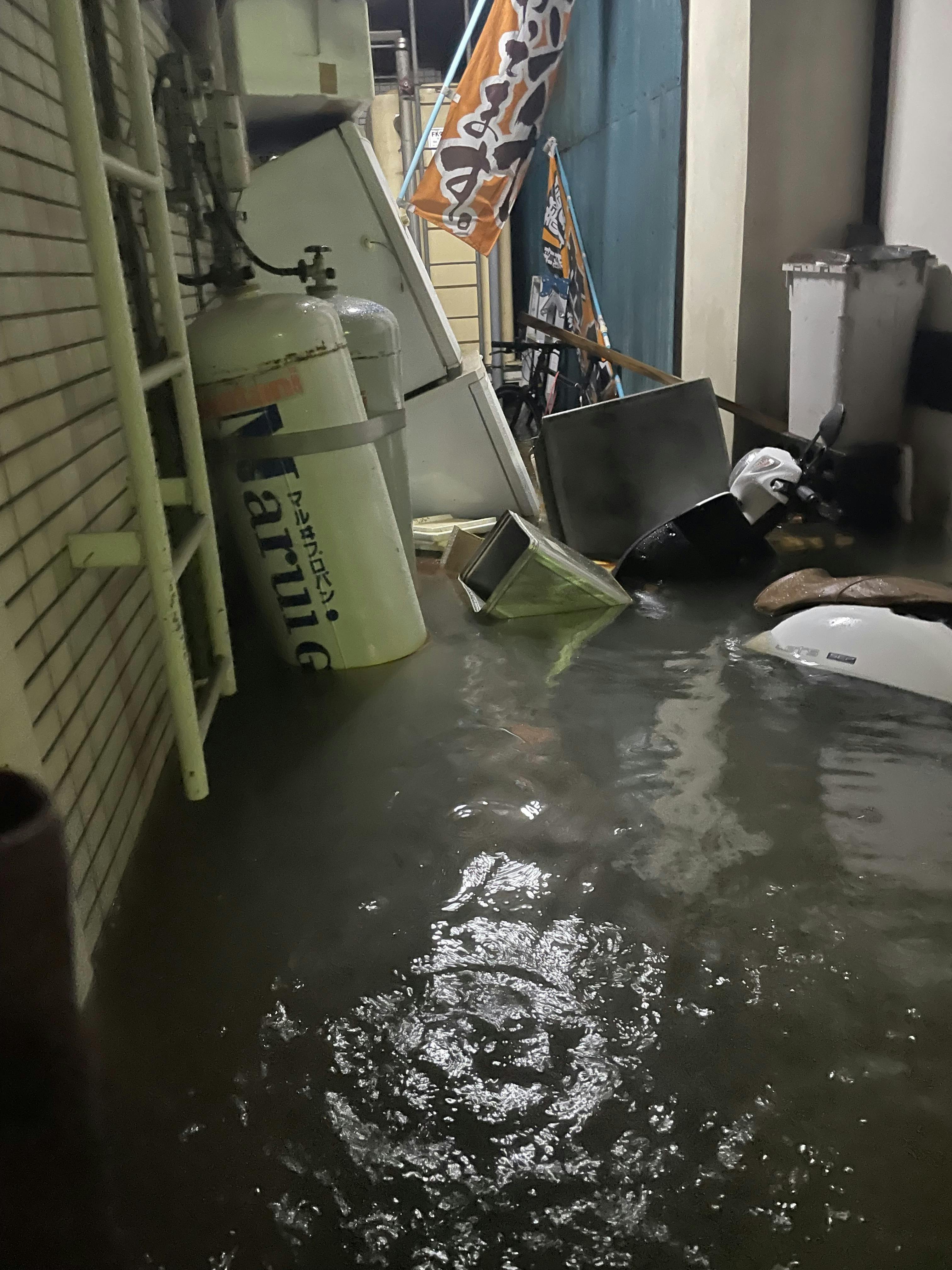 熊本市中央区船場町下1丁目にて大雨が降り続き、下水が逆流し始めたことから店内にあるグリーストラップから油を含んだ汚水が店内に逆流し始め、1:00にはドアの隙間からみるみるうちに店内に浸水し、その時点で命の危険を感じ逃げました。しばらくすると、店の裏を流れる坪井川が氾濫し、地形上低くなってる当店の方へ水が向かってきてしまい最終的には床上80センチまで浸水しました。