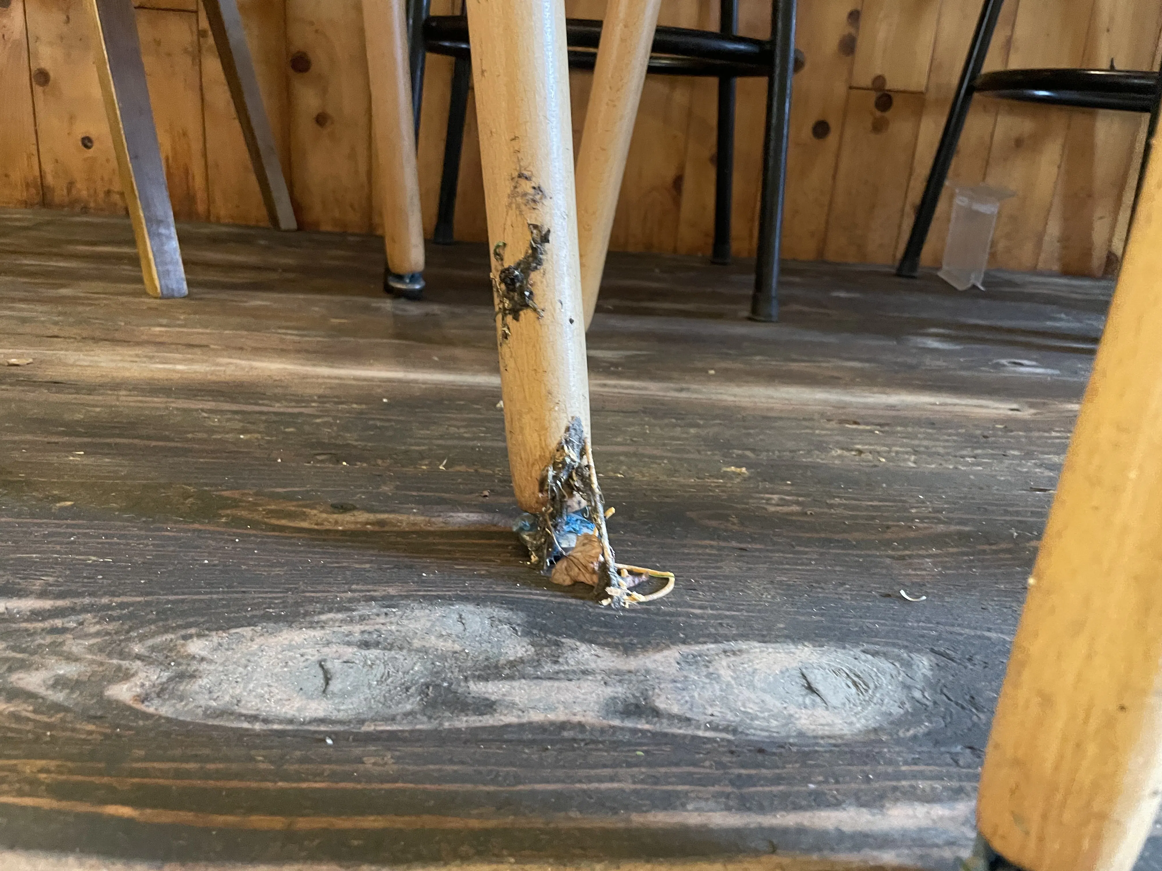水が引いたあと、ヘドロと油が付着した椅子と床私たちの目標は2つあります。