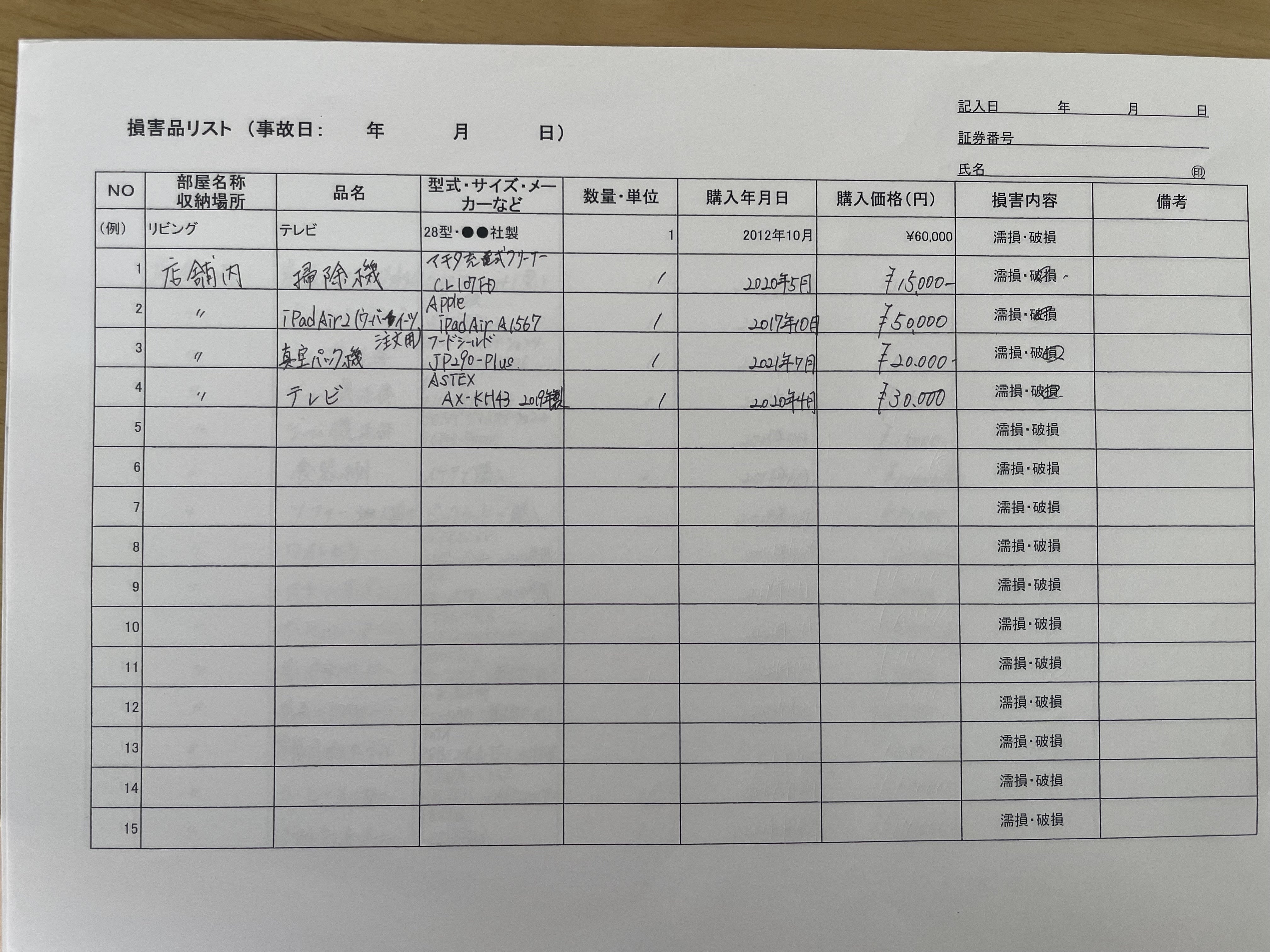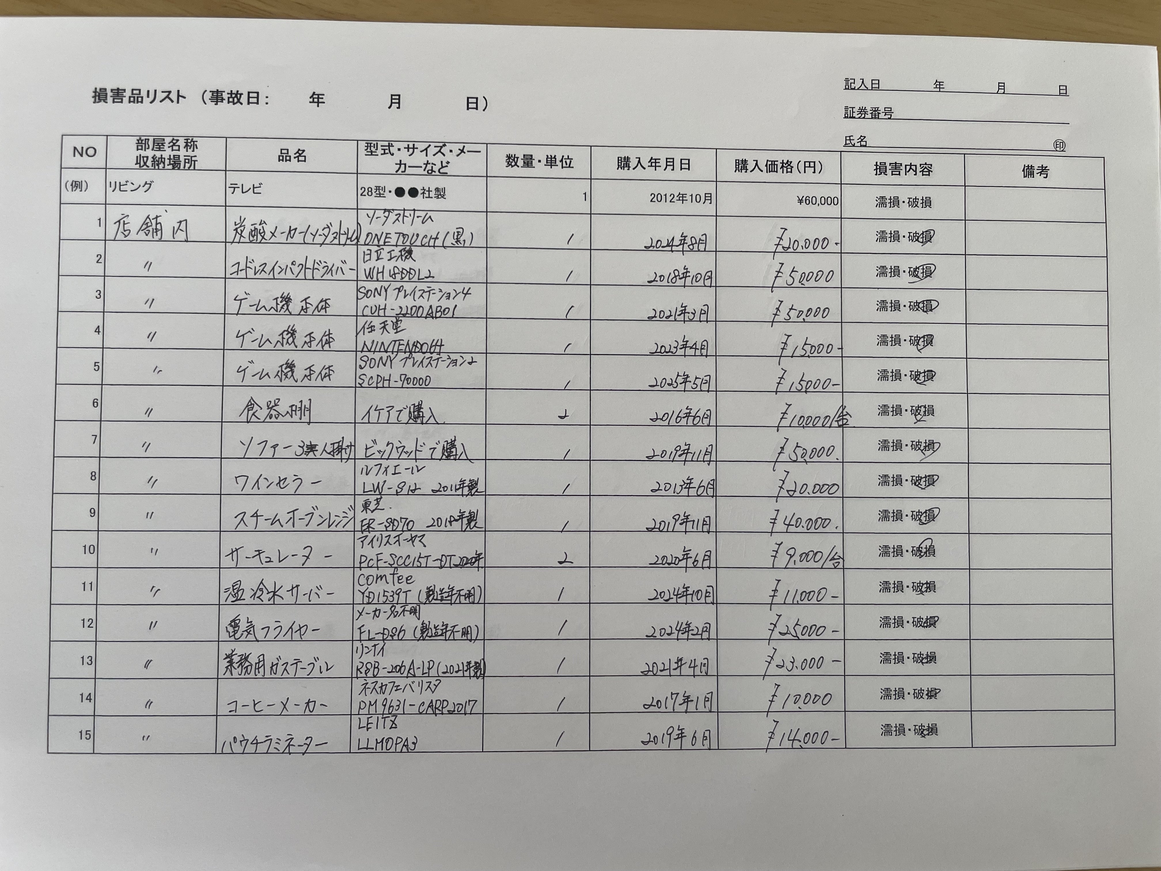 保険会社に提出した被害品一覧