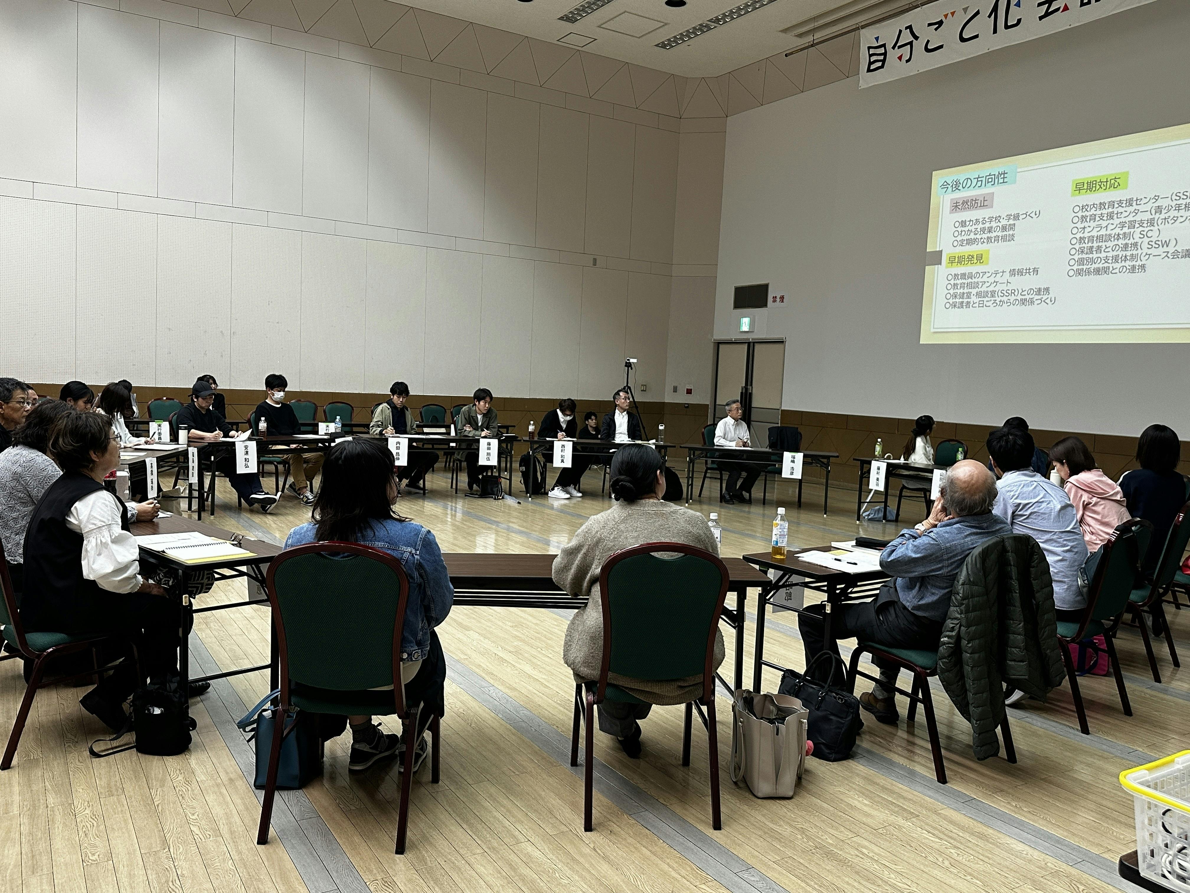 過去に「原発」「自然エネルギー」「学校給食」というテーマで開催してきました。今回は島根県は小学校・中学校ともに不登校率が全国3位であること、ネクスト自分ごと化会議やネット投票でのアンケート結果などをもとに、「子どもファーストな学校」をテーマにしました。