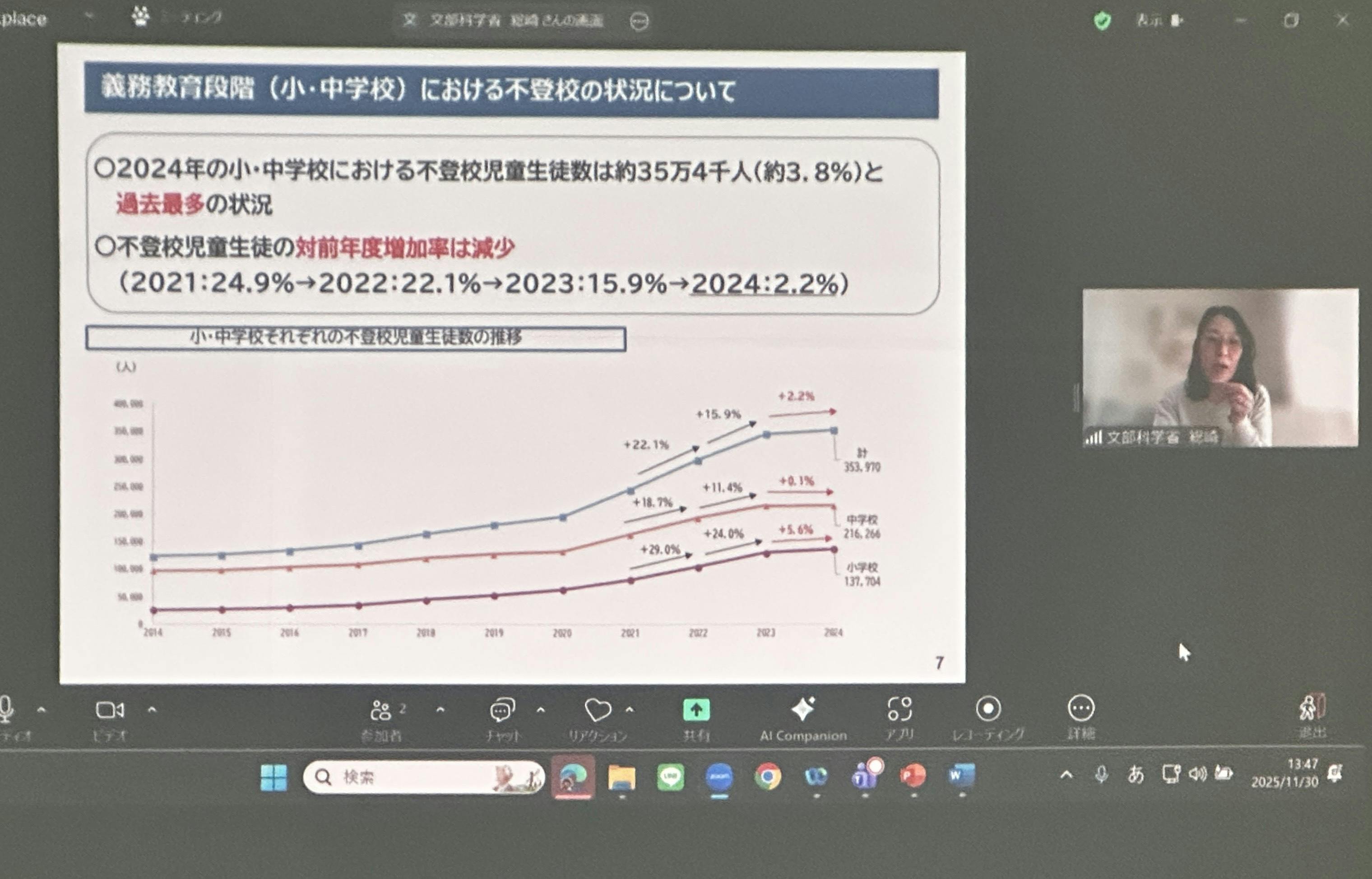 続いて文部科学省の不登校対策「COCOLOプラン」について文科省の総崎由紀さまより「COCOLOプラン」についてのご説明をいただきました。