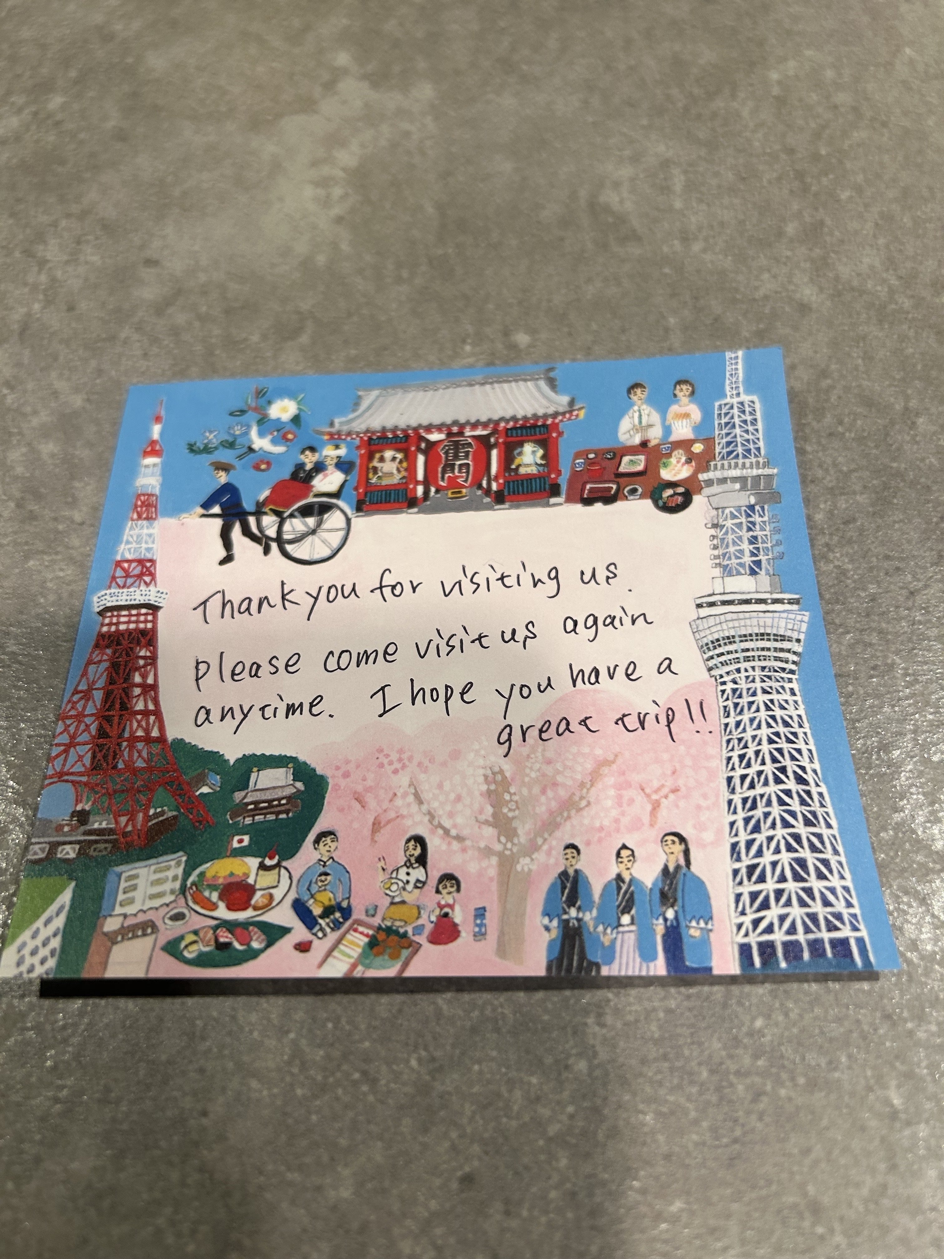 海外からのお客様も多く、英語は話せませんがGoogle翻訳でコミュニケーションを取り、日本らしい絵が描かれたメモ帳に一言メッセージを添えてお渡しするサービスも喜ばれています。
