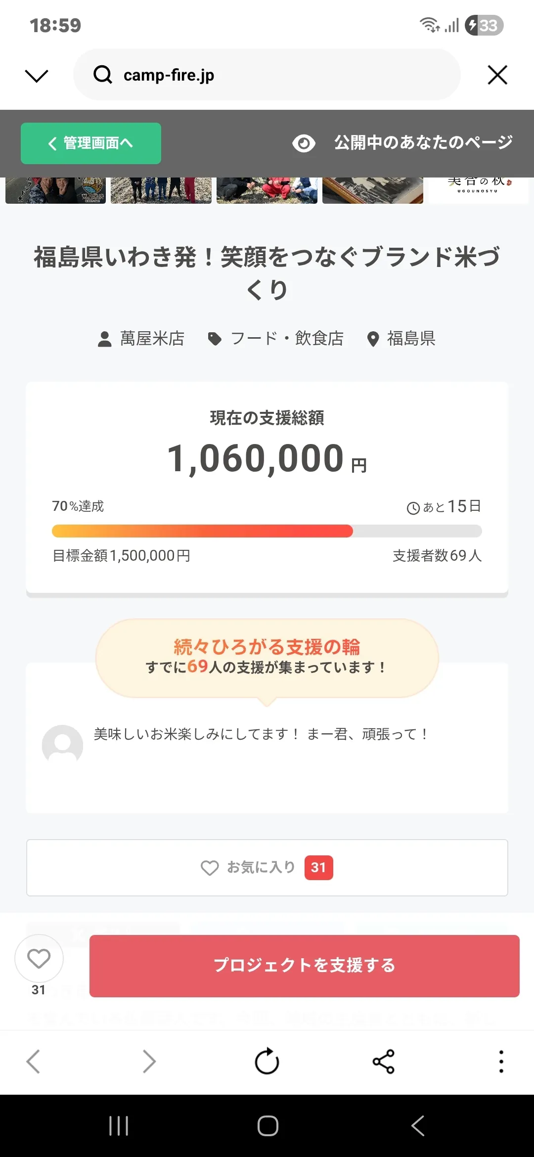 2026/01/16 19:24こんばんは!!プロジェクトオーナー萬屋米店です。つい昨日、1つの目標としていました100万円の大台を突破致しました!!!ご寄付いただいた皆様本当にありがとうございました。地元の方はもちろんですが、県外にお住まいのいわき市出身の方、また全国各地からこの取り組みの素晴らしさを応援してくれる方など、本当にたくさんのご寄付者様と繋がりを持つことが出来ました。クラウドファンディングは、ただの資金集めではなく人と人を結ぶ架け橋となっていると感じます。そもそも、私たちもこの素晴らしい取り組みを後世に残すことが目的です。米業界だけでなく、農業、飲食その他あらゆる業種の職業が受け継がれ、またさらに次の世代へバトンを繋ぐ。その為には、入り口が必要です。私たち美合の秋という集団が、その入り口となって担い手を育てていければと考えております。残り15日、もう15日?いや!!!まだ15日ある!!是非、インスタグラムやフェイスブックでの拡散、宜しくお願い致します。 もっと見る