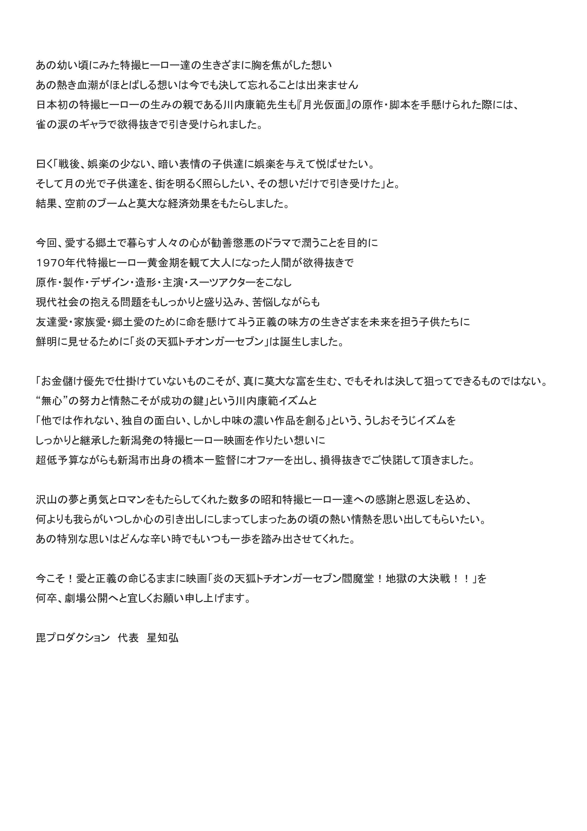 友達愛、家族愛、郷土愛の為に命を懸けて斗う正義の味方の生き様を未来担う子供達に鮮明に見せる為生まれた「炎の天狐トチオンガーセブン」。昔懐かしい特撮をお父さんお母さん、お爺ちゃん、お婆ちゃんが見る事で家族3世代共通の話題がお茶の間を賑わし、よりアットホームな家庭ができると確信いたします。そのような素晴らしい映画をあなた様のお力をいただくことで少しでも世間が明るい話題で持ちきりになり、より住みやすい街づくりや恐ろしい事件などがなくなる社会を作っていけると考えております。