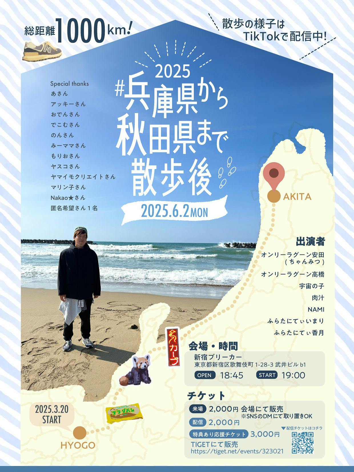 普段は漫才をしておりますオンリーラグーンのちゃんみつと申します。僕は日本と散歩が大好きでこれまで2023年に北海道から東京まで、2024年は地元の石川県から大阪を経由して東京まで歩きました。そして2025年の3月、兵庫県の甲子園から秋田県の秋田駅まで1300kmの徒歩の旅をしました。そこで沢山の場所を訪れ、魅力を発信してきました。今回のプロジェクトでは、その経験を活かし、オンラインを通じてより日本の美しさと人々の温かさを共有したいと思っています。