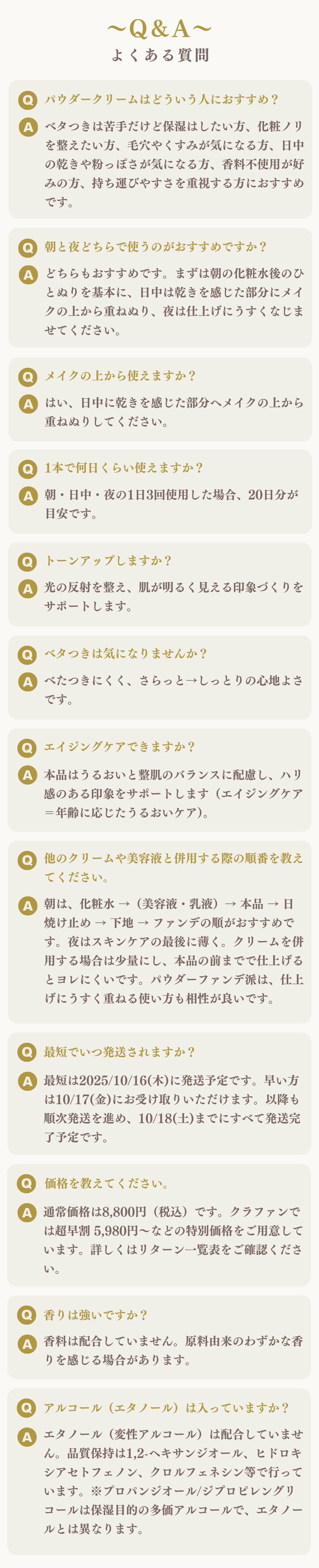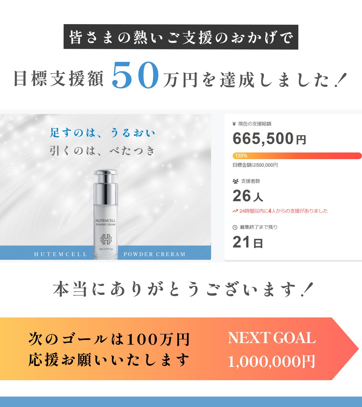 2025/09/26 18:00クラファン開始から5日で『目標の50万円を達成』することができました!これも皆さまの熱いご支援のおかげです。ありがとうございます!ネクストゴールの目標は倍の100万円に設定させていただきました。引きつづき応援よろしくお願いいたします!▼商品の詳細を見るhttps://camp-fire.jp/projects/882624/view足すのはうるおい、引くのはベタつき。今回の新商品パウダークリームはとにかく『べたつかないのにしっかり保湿できる』という点がモニター様にも一番評価をいただています。また、携帯性にも優れていて朝・夜以外にも外出先でもメイクの上からサッと保湿できるという点も評価していただきました。本当にベタつかないので手洗いも不要です。本商品の特徴とその他の保湿○○との違いを下記の表にまとめました。クリームは重く、ミストは崩れ、バームはテカる。こんなお悩みをもつ方に大変おすすめです。これだけの◎を実現するために辿りついた答えは「パウダーがクリームに変わる処方」この処方だからこそ、・見た目はさらり、中はしっとり、ヨレにくい・朝/日中(メイクの上から)/夜も使える・顔全体や目元・口元などのポイント保湿もOKを達成することができました。詳しい使い方などはプロジェクトページでご確認ください。▼プロジェクトページhttps://camp-fire.jp/projects/882624/view もっと見る
