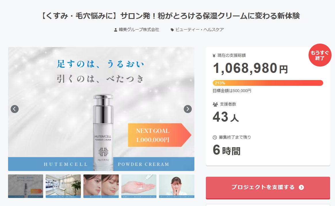 2025/10/15 18:37【達成率213%】初めてのクラウドファンディングも本日15日(水)が最終日!たくさんのご支援をいただき、本当にありがとうございます!最後まで応援よろしくお願いいたします!▼プロジェクトページを見るhttps://camp-fire.jp/projects/882624/view私たちが5年悩み「パウダーがクリームに変わる処方」にたどり着いた理由見た目はさらり。中はしっとり。この両立が長年の課題でした。クリームは重く、ミストは崩れ、バームはテカる。悩み抜いた私たちは「パウダーがクリームに変わる処方」にたどり着きました。その名も、HUTEMCELL POWDER CREAM(ヒューテムセル パウダークリーム)。手の上でパウダーがクリーム状に変わったら、顔全体や目元などの気になる部分へうすくなじませる。足すのはうるおい、引くのはベタつき。さらに重ねてもヨレにくい。実はこのパウダー、うるおい成分を抱えた「マイクロカプセル」なんです実はパウダークリームの微細なパウダーは、1粒1粒がうるおいをぎゅっと包み込んだマイクロカプセル。独自の球状カプセル構造で、中はうるおい成分、外はツヤをまとわせる薄い層。パウダーを指先で触れるとカプセルから贅沢なうるおい成分が弾けだして、乾燥による毛穴・くすみ・なめらかな印象をケア*します。*いずれも見た目の印象▼成分の詳細がこちらhttps://camp-fire.jp/projects/882624/view もっと見る
