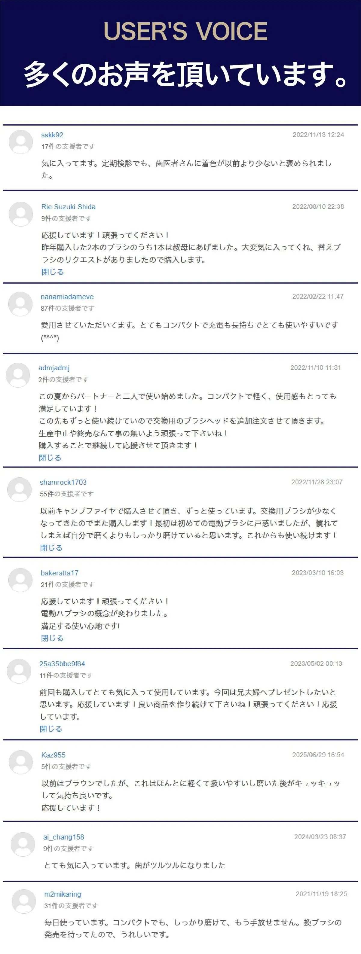 2026/02/14 20:00日頃より、多くのご支援ありがとうございます。「替えブラシ」のリターンを販売しておりますので、ご案内させて頂きます。<こちらで開催中>https://camp-fire.jp/projects/914025/view(※ミニマルソニック2本目のご購入もオススメです。)この機会に是非、ご利用下さいませ。引き続き、ミニマルソニックをどうぞよろしくお願い申し上げます。ミニマルトゥースラボスタッフ一同 もっと見る【替えブラシ】リターン販売中のご案内
