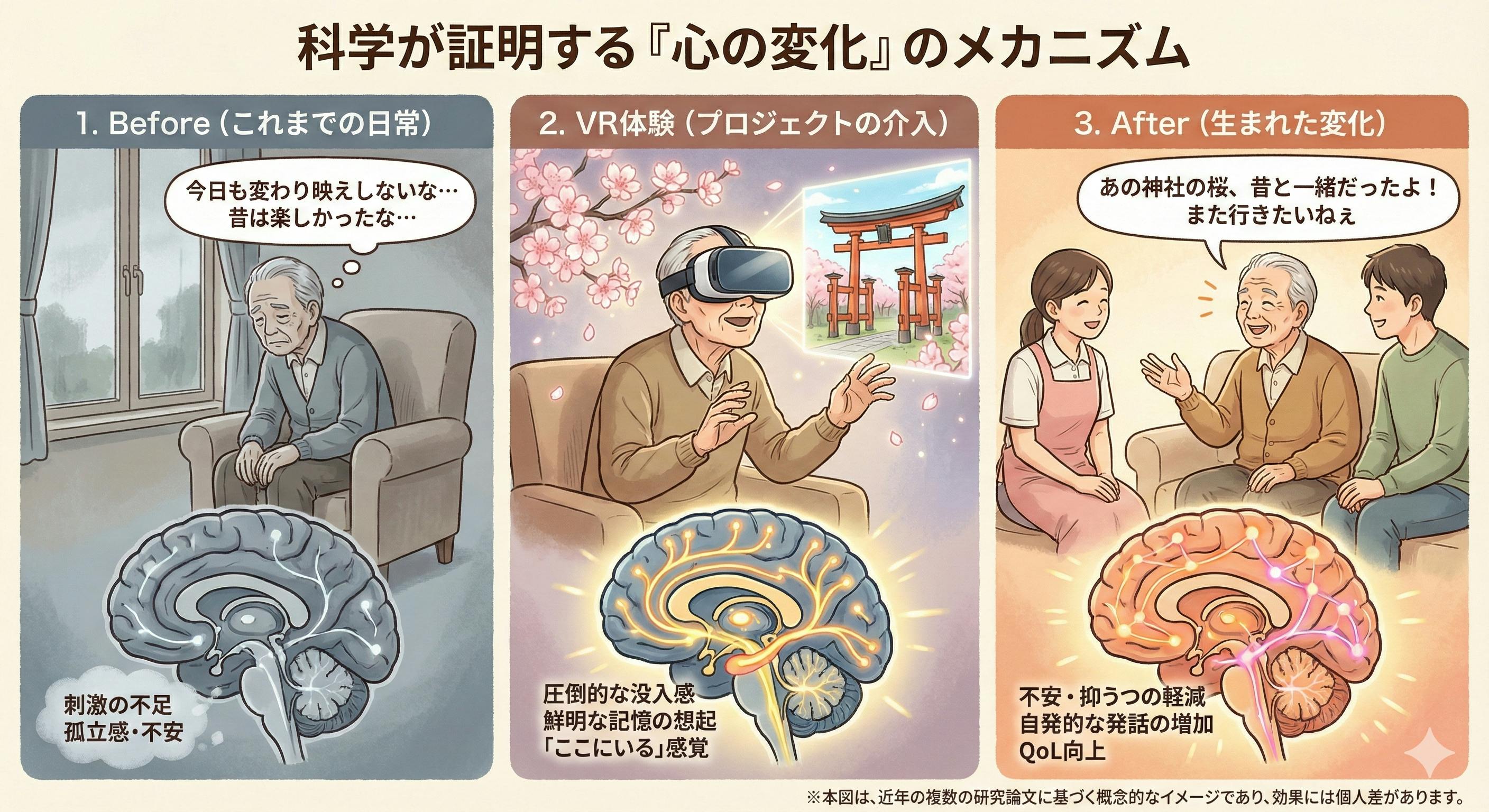 でもVRと認知症の関係については、近年非常に多くの学術的な研究が行われており、その効果は科学的にも注目されています。