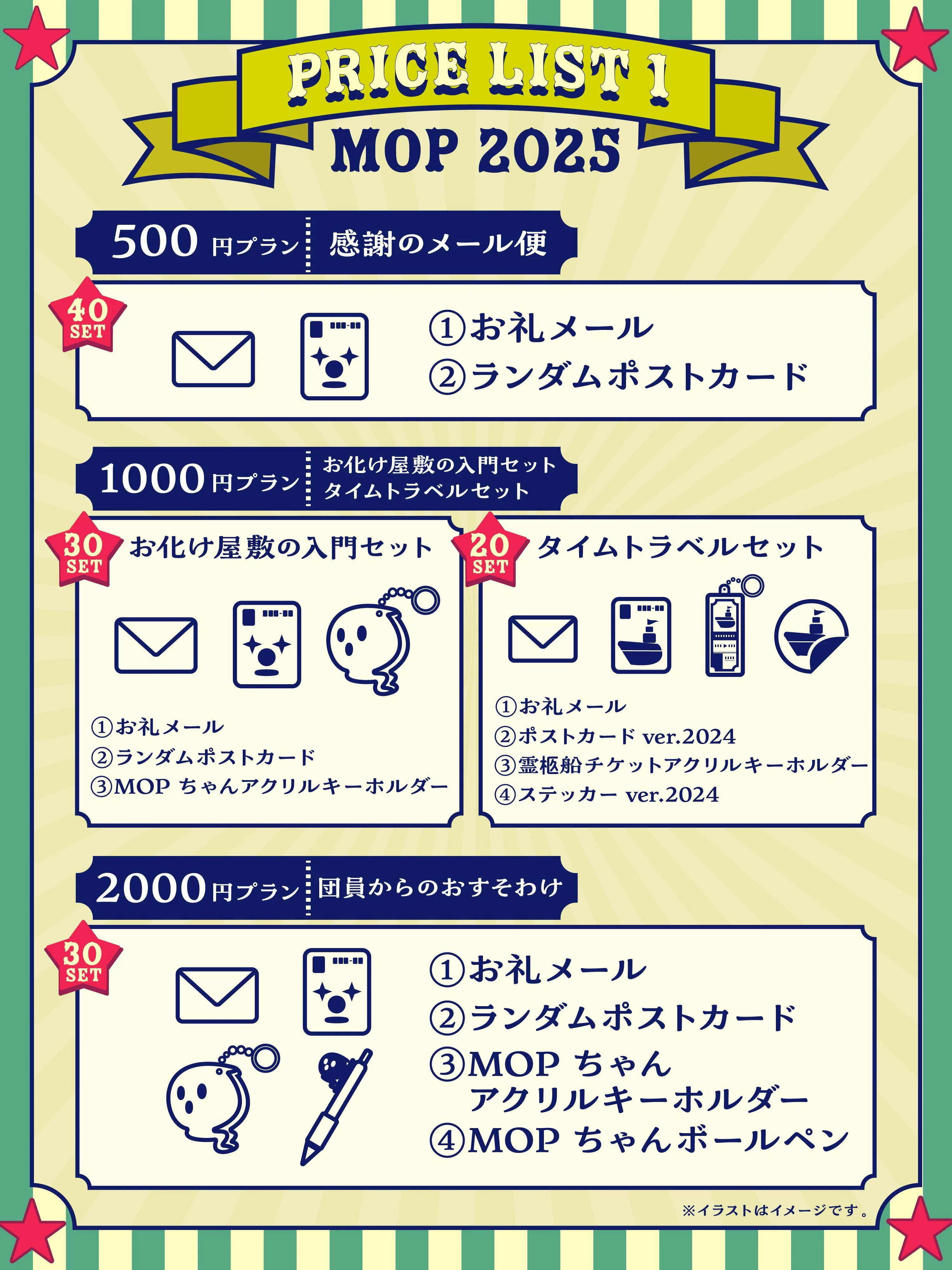メール(スマホ/pc壁紙)、ランダムポストカード、mopちゃんアクキー、mopちゃんボールペン、mopちゃん3種ステッカー、お化け屋敷体験映像