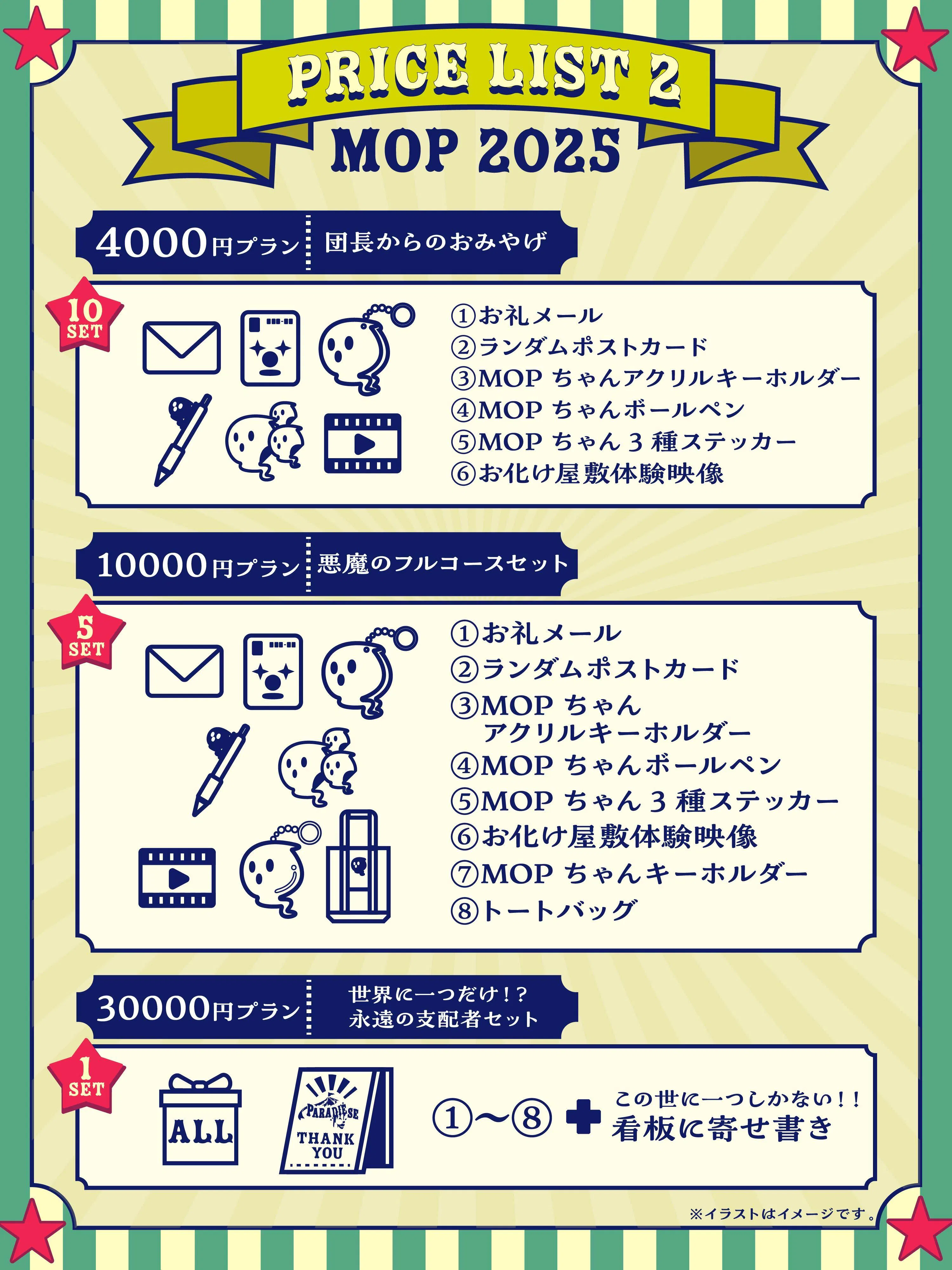 メール(スマホ/pc壁紙)、ランダムポストカード、mopちゃんアクキー、mopちゃんボールペン、mopちゃん3種ステッカー、お化け屋敷体験映像、mopちゃんキーホルダー、トートバッグ、看板(本番当日に使用した一点物の看板をお付けします。裏にはMOPメンバーからの感謝の寄せ書きをさせていただきます!※掲出品のため小傷・擦れがある場合があります。)