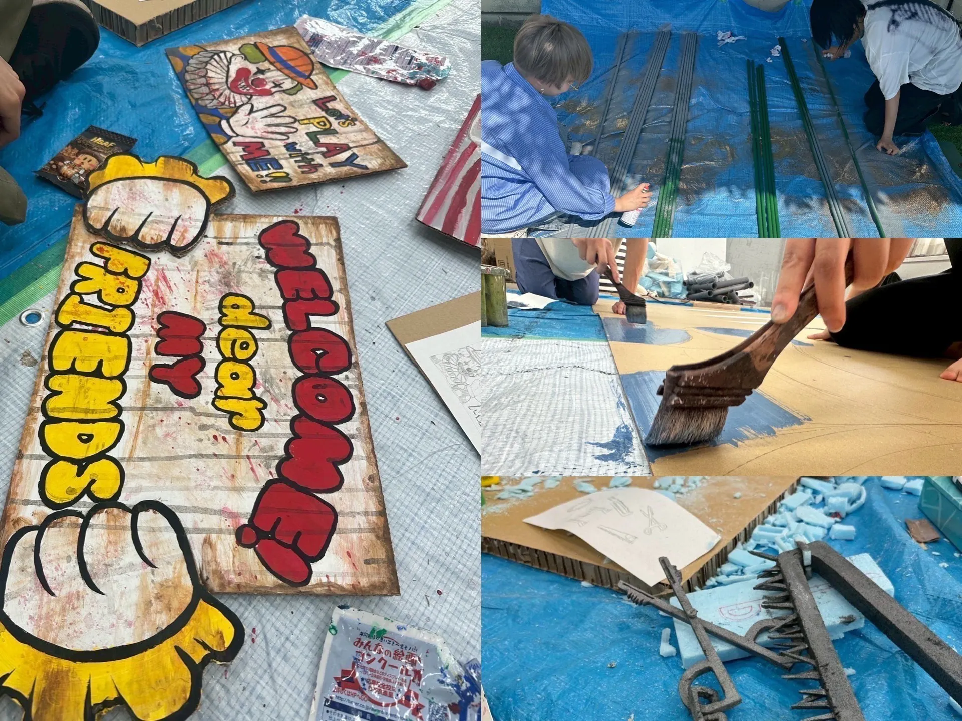 お化け屋敷内を4つのチームに分けて、日々制作しています。スタイロや粘土を使った立体的な小物等から、ギミックや仕掛け、ダンボールパネルに塗装する大量の壁まで、鋭意制作中!