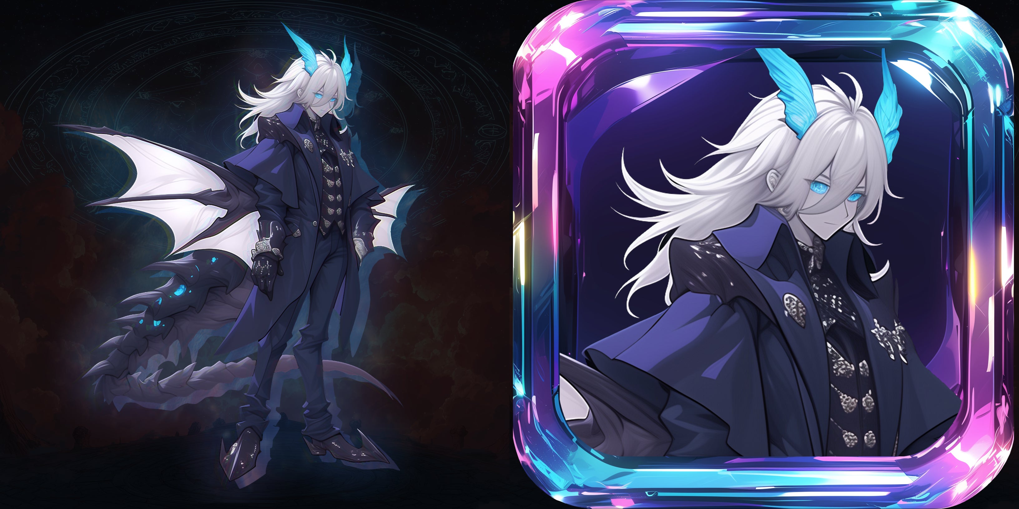 蒼い角と白銀の髪を持つ、静謐で神秘的な後衛英雄。硬質な翼と尾に灯る青い結晶光。
