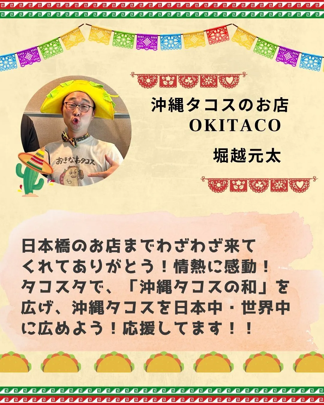 【応援メッセージ紹介】Vol.5 沖縄タコスのお店 OKITACO 堀越元太さん