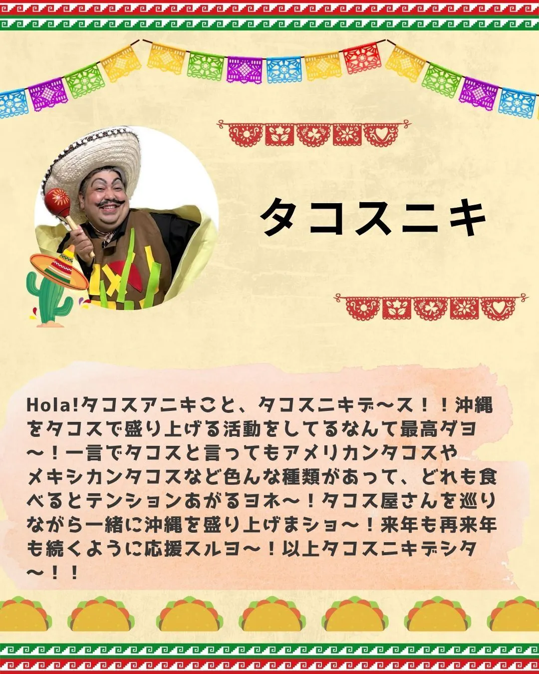 2025/11/07 21:38応援メッセージ紹介Vol.7 タコスニキタコスニキさんから応援メッセージを頂きました!タコスニキさんタコス愛溢れるメッセージありがとうございます!ーーーーーーーーーーーーーーーーーーーーーーータコスニキさんプロフィール父がメキシコ人、母が沖縄人。メキシコシティ生まれ、宜野湾育ち。好きな四字熟語は、「多幸寿人(タコスんちゅ)」ーーーーーーーーーーーーーーーーーーーーーー「多幸寿人(タコスんちゅ)」ってタコス好きを形容するのにぴったりな言葉ですね!沖縄そばで言う「沖縄そばじょーぐー」的な言葉がタコスにはないなーとおも言っていたのでので、「多幸寿人(タコスんちゅ)」が今後沖縄で広まっていくのが楽しみです!タコスニキさんがおっしゃるように、一言でタコスと言ってもアメリカンタコスやメキシカンタコス、そして沖縄タコスなどいろんな種類があって、お店によって個性があります!「タコススタンプラリー」に参加してぜひそれを感じてほしいです!タコスニキさんこれからも応援よろしくおねがいします!そして私たち「タコスタ」もタコスニキさんを全力で応援いたします! もっと見る