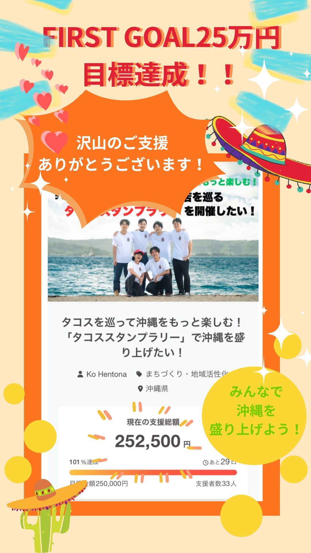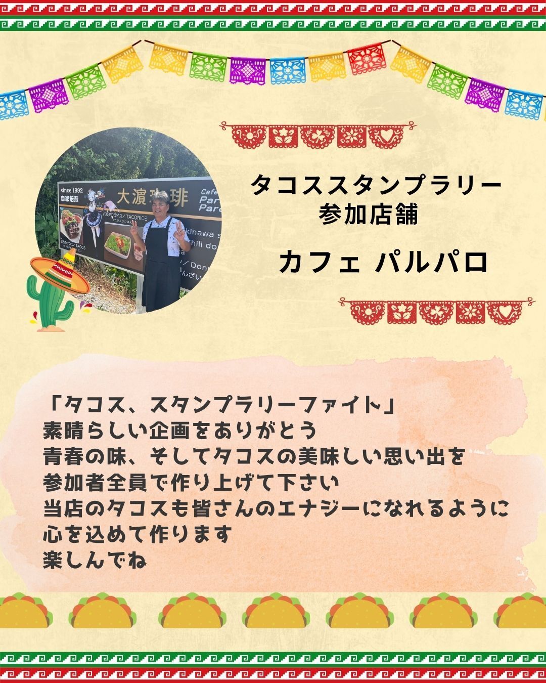 応援メッセージ紹介Vol.7 タコスニキタコスニキさんから応援メッセージを頂きました!タコスニキさんタコス愛溢れるメッセージありがとうございます!ーーーーーーーーーーーーーーーーーーーーーーータコスニキさんプロフィール父がメキシコ人、母が沖縄人。メキシコシティ生まれ、宜野湾育ち。好きな四字熟語は、「多幸寿人(タコスんちゅ)」ーーーーーーーーーーーーーーーーーーーーーー「多幸寿人(タコスんちゅ)」ってタコス好きを形容するのにぴったりな言葉ですね!沖縄そばで言う「沖縄そばじょーぐー」的な言葉がタコスにはないなーとおも言っていたのでので、「多幸寿人(タコスんちゅ)」が今後沖縄で広まっていくのが楽しみです!タコスニキさんがおっしゃるように、一言でタコスと言ってもアメリカンタコスやメキシカンタコス、そして沖縄タコスなどいろんな種類があって、お店によって個性があります!「タコススタンプラリー」に参加してぜひそれを感じてほしいです!タコスニキさんこれからも応援よろしくおねがいします!そして私たち「タコスタ」もタコスニキさんを全力で応援いたします!