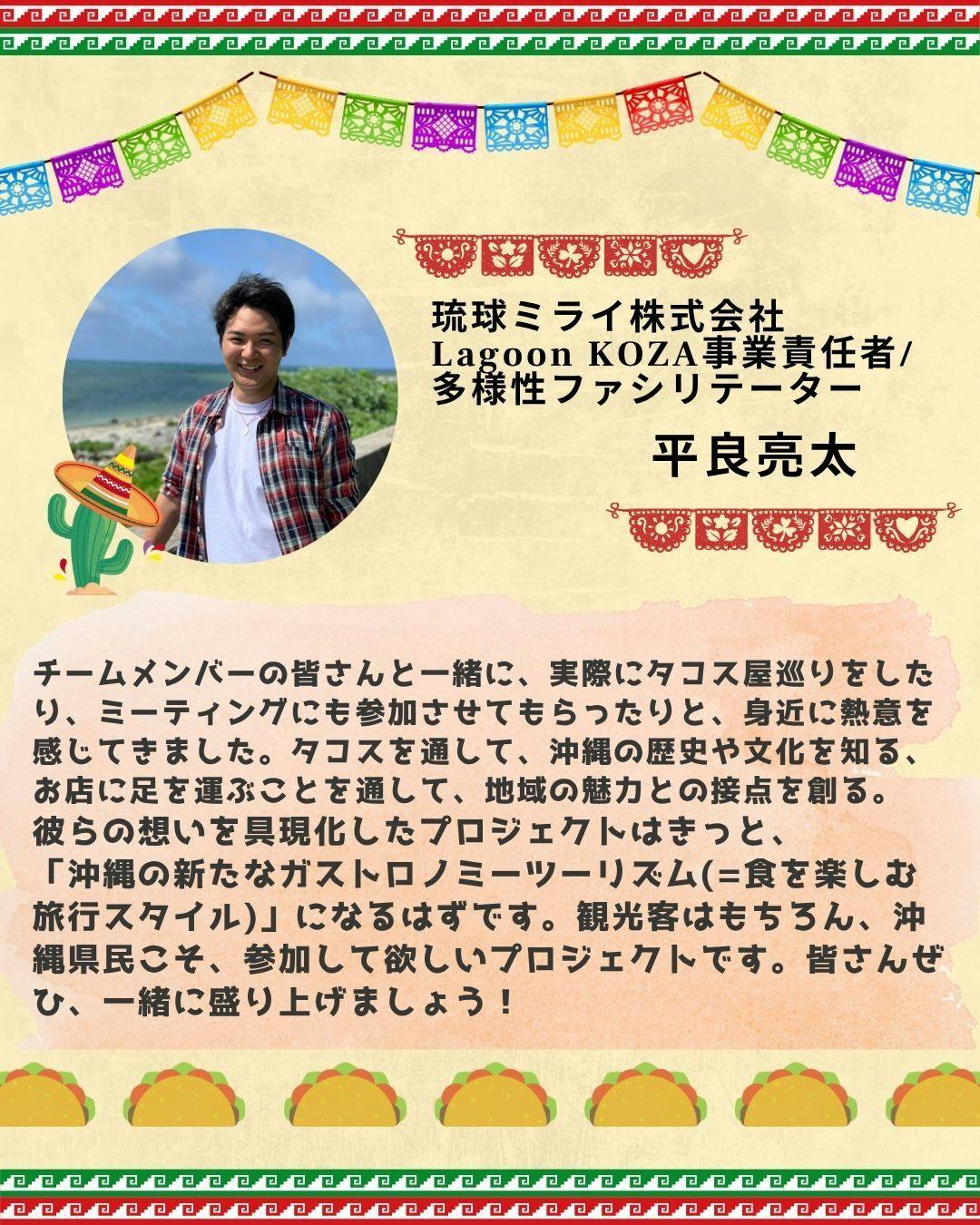 琉球ミライ株式会社 Lagoon KOZA事業責任者/多様性ファシリテーター平良亮太さん亮太さん、素敵なメッセージをありがとうございます!亮太さんは、僕らメンバーのうち2人がスタッフとして勤めているスタートアップ支援施設「Lagoon KOZA」の事業責任者で、いつも一番身近から僕らを応援してくださっている方の一人です。企画の立ち上げ当初から企画設計や想いの言語化の部分で多くのアドバイスをいただき、さらに僕らのミーティングに参加してファシリテーションをしてくださったり、一緒にタコス巡りにも行ってくださったりと、チームの一員のように関わっていただきました!一緒にタコスを食べ歩いたことをきっかけに、「タコスにハマった!」と言ってくれたときは本当にうれしかったです。ある意味、僕らのタコス愛が伝わった最初のユーザーであり、ほぼメンバーの一人と言っても過言ではありません!!地域の魅力との接点を創れるようなスタンプラリー。沖縄の新しい「ガストロノミーツーリズム」を目指して、頑張っていきます!次回の応援メッセージ紹介もお楽しみに!