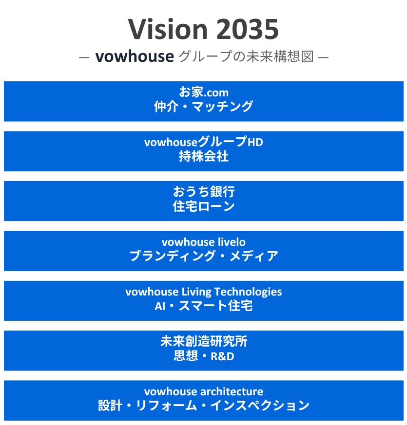 vowhouseグループは、「自由・平等・博愛」をテーマに、2035年までに住まい創造グループを確立します。令和のコングロマリットを目指します。2035年上場目標