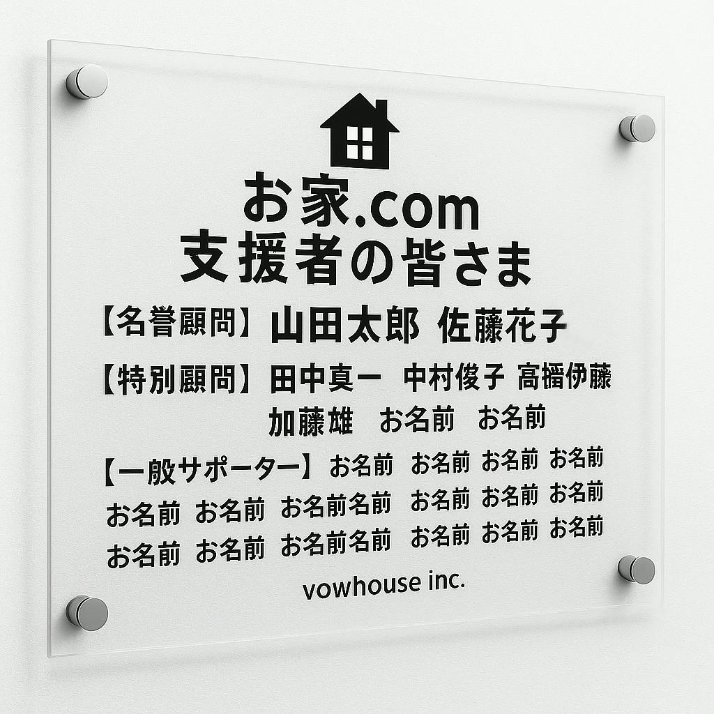 「創業支援者名簿」は、本プロジェクトが成功した場合に制作する弊社公式サイト(vowhouse.jp予定)内の専用ページに掲載いたします。サイト公開は、支援金振込確認後2〜3か月程度お時間をいただく可能性があります。