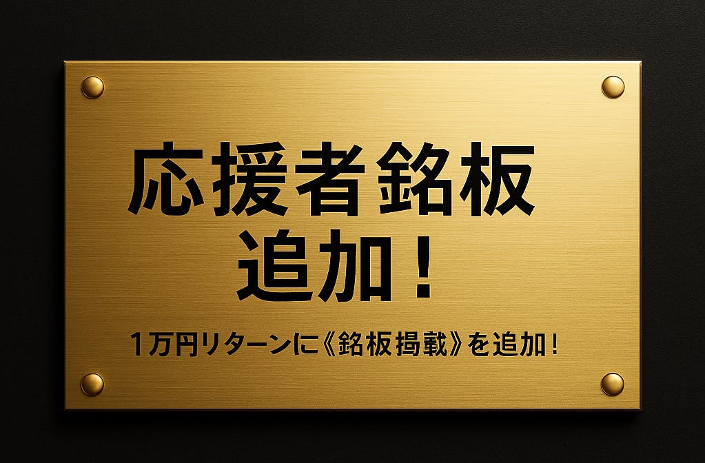 2025/11/21 15:53今日は大切なお知らせがあります。なんと、1万円リターンに《応援者銘板へのお名前掲載》を追加しました!本来はもっと上位リターン向けの内容ですが、「せっかく応援してくださる皆さまに、より強く形として残る価値をお届けしたい」という想いから、追加費用なしで提供することを決めました。 銘板とは?私がこれから立ち上げる“住まいの新しい仕組みづくり” を応援してくださった方のお名前を、事務所に掲示する記念プレート(銘板) に刻むものです。原則、本名ニックネーム可支援いただいた「証」が、ずっと残る形になります。 なぜこんなことを?今回の挑戦は、“不動産仲介の新しい選択肢をつくる” という大きなテーマです。そのスタートを支えてくださった皆さまの存在を、自分自身も忘れず、事務所に掲げて歩んでいきたいと強く思っています。そして何より——応援してくださる皆さまに、少しでも喜んでいただけるものを届けたい。その気持ちだけです。 すでに1万円を支援済みの方へもちろん 自動で対象になります。追加のお手続きは一切不要ですのでご安心ください。 残り23日。ここから本気で走ります。プロジェクトも折り返しです。ぜひ引き続き応援いただけると嬉しいです。「見てほしい人に届きますように」そんな想いを込めて、最後までやり切ります。画像はイメージです。実際の物とは相違する可能性があります もっと見る