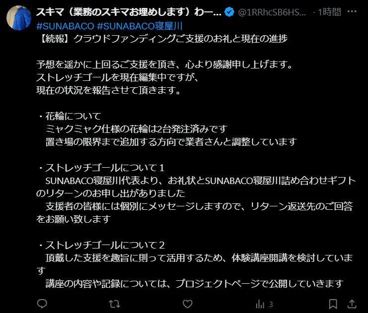 SUNABACO寝屋川代表より、お礼状とSUNABACO寝屋川詰め合わせギフトのリターンの申し出がありました