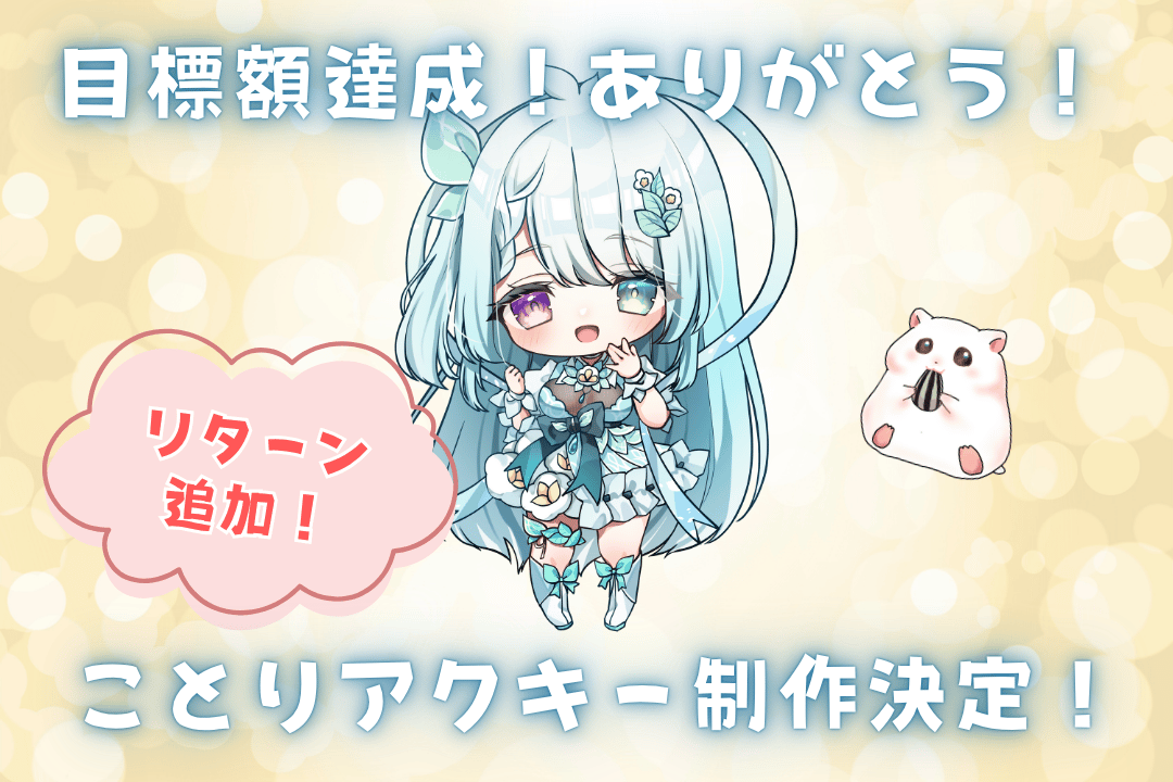 目標額達成しました!たくさんの応援ありがとうございます!!ご支援くださっているみなさま、ページを見てくださってるみなさま、本当にありがとうございます・・・!本日、ありがたいことに目標金額を達成することができました・・・!!開始1週間ほどで達成することができ、本当に感無量の気持ちでいっぱいです。ご支援くださったみなさん、本当にありがとうございます!感謝を込めて、リターンを追加致します!こんなに早く目標金額に到達できたことの感謝を込めて、リターンをひとつ追加させていただくことに決めました。おおぞらことりのSDキャラのアクキーを制作し、こちらを3000円以上の支援を頂いたみなさま全員にお送りさせていただきます!クラファンをしようと決めた背景のひとつに応援してくれたみんなに自分が思うかたちでありがとうが届けられるからというのがありました。ライドリを導入したのも同じ理由で、みんなから頂く支援や投げ銭に対して「ありがとう」をもっといいかたちで伝えられたらいいなとずっと思ってきました。SHOWROOMでランキングなどを気にしながらがんばっていたときには終わったらすぐに次のイベントを考える状況で、妖精業務をしながらの配信のなかで思うように時間が作れず、みんなに十分にお礼をできなかったなぁといつもどこかで気にしていたので今回はすべて自分でできるぶん、やれることはやろうと思っていました。何より、人間の人生でも妖精になってからも一度もやったことのないクラウドファンディングだったので最初は本当にどうなるかと震えながらはじまりました。それが蓋を開けてみれば本当にたくさんの支援を頂いてこんなに早く目標を達成できる未来がくるなんて!みんな、本当に本当にありがとうー!ここからはさらなる夢の実現に向けて、ネクストゴールを打ち出して参ります!まだ呼びかけ切れてない場所がいろいろあるのでSHOWROOMでも改めて支援の呼びかけをさせて頂くつもりです。おおぞらことり初のグッズがこのアクキーとピンバッジになりますのでどちらもこだわりぬいて素敵なものをお届けしたいなぁー!支援くださったみんな、ぜひ楽しみに待っててねー!