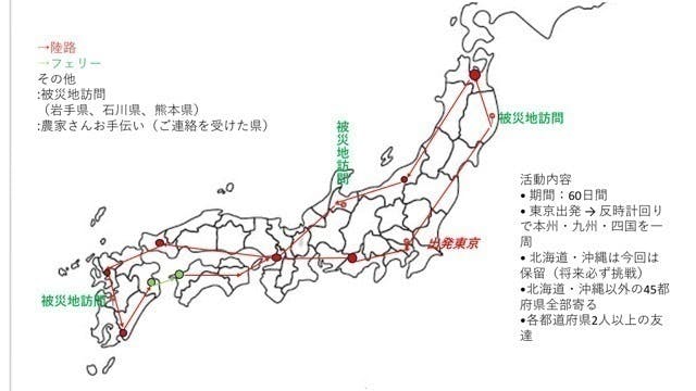 この旅のゴールは走り切ることではなく、47都道府県で人と出会い、友達になり、共に笑い合うことです。各都道府県2人以上の友達を作り完走後には“友達100人”