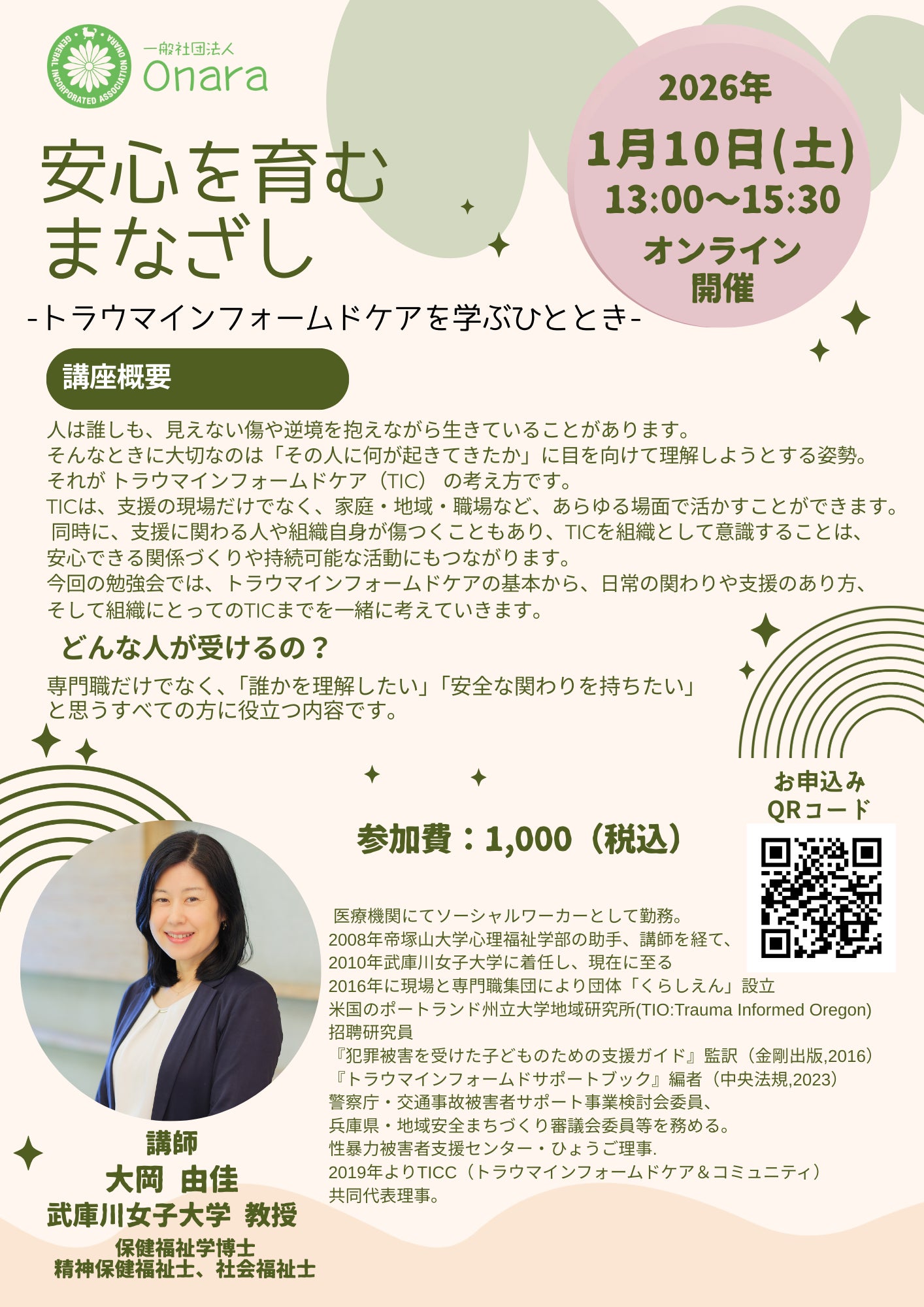 2026/01/05 19:31こんばんは!Onaraの丘咲つぐみです。トラウマインフォームドケアをご存じですか?トラウマインフォームドケアとは、相手の行動の背景に「トラウマがあるかもしれない」という視点を持って関わるアプローチのことです。トラウマインフォームドケアな関わりがあると、トラウマを抱える当事者は安心して自分の力を取り戻しやすくなり、周囲の人も無用なすれ違いや傷つけ合いを減らすことができます。これから制作していく映画を通して、社会に広めていきたい!と考えていることの一つです!今週末にオンラインにて講座を開きます。ぜひ、ひとりでも多くの方にご受講をいただけますと幸いです。100ページ相当の資料とアーカイブ動画もお渡ししますので、講座終了後、繰り返し学んで頂くことができます。講座概要開催日時:2026年1月10日(土)13時~15時30分開催方法:オンライン(zoom)参加費:1,000円(税込)講師: 大岡由佳先生(武庫川女子大学 教授)ー学べる内容ー 〇トラウマインフォームドケアとは?〇TICとTSC〇トラウマとは?〇ACEとは?〇トラウマの影響〇トラウマのサインに気付く〇トラウマインフォームドケアの実践〇再トラウマを招かない(二次被害など)〇二次受傷〇TICに絡む米国の動き〇PTG(心的外傷後成長)お申込みはこちらよりお願いいたします。https://onara-trauma-informed.peatix.com/ もっと見る