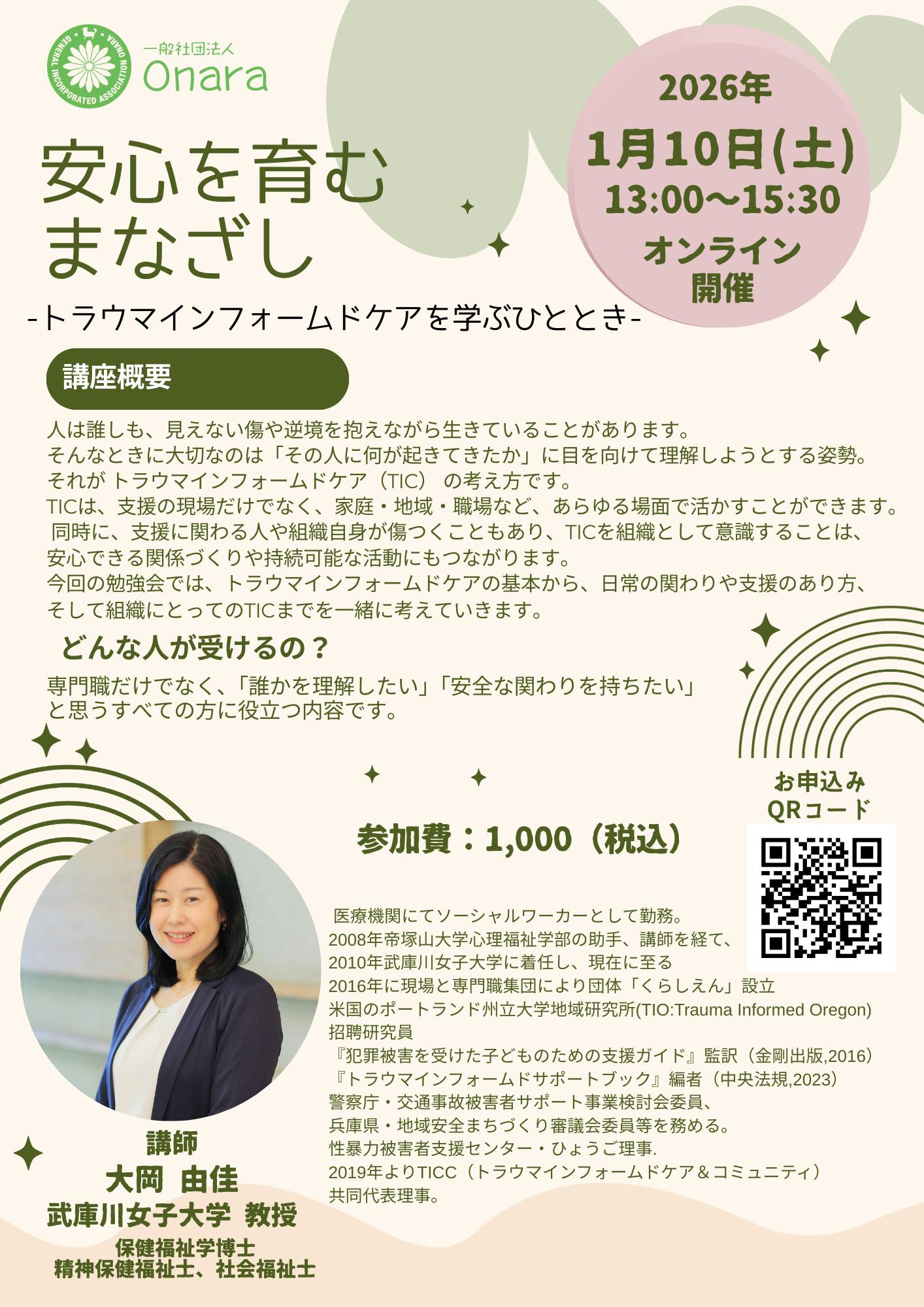 2026/01/05 19:31こんばんは!Onaraの丘咲つぐみです。トラウマインフォームドケアをご存じですか?トラウマインフォームドケアとは、相手の行動の背景に「トラウマがあるかもしれない」という視点を持って関わるアプローチのことです。トラウマインフォームドケアな関わりがあると、トラウマを抱える当事者は安心して自分の力を取り戻しやすくなり、周囲の人も無用なすれ違いや傷つけ合いを減らすことができます。これから制作していく映画を通して、社会に広めていきたい!と考えていることの一つです!今週末にオンラインにて講座を開きます。ぜひ、ひとりでも多くの方にご受講をいただけますと幸いです。100ページ相当の資料とアーカイブ動画もお渡ししますので、講座終了後、繰り返し学んで頂くことができます。講座概要開催日時:2026年1月10日(土)13時~15時30分開催方法:オンライン(zoom)参加費:1,000円(税込)講師: 大岡由佳先生(武庫川女子大学 教授)ー学べる内容ー 〇トラウマインフォームドケアとは?〇TICとTSC〇トラウマとは?〇ACEとは?〇トラウマの影響〇トラウマのサインに気付く〇トラウマインフォームドケアの実践〇再トラウマを招かない(二次被害など)〇二次受傷〇TICに絡む米国の動き〇PTG(心的外傷後成長)お申込みはこちらよりお願いいたします。https://onara-trauma-informed.peatix.com/ もっと見るいよいよ決起集会に向けて(ご参加意思表明のお願い)