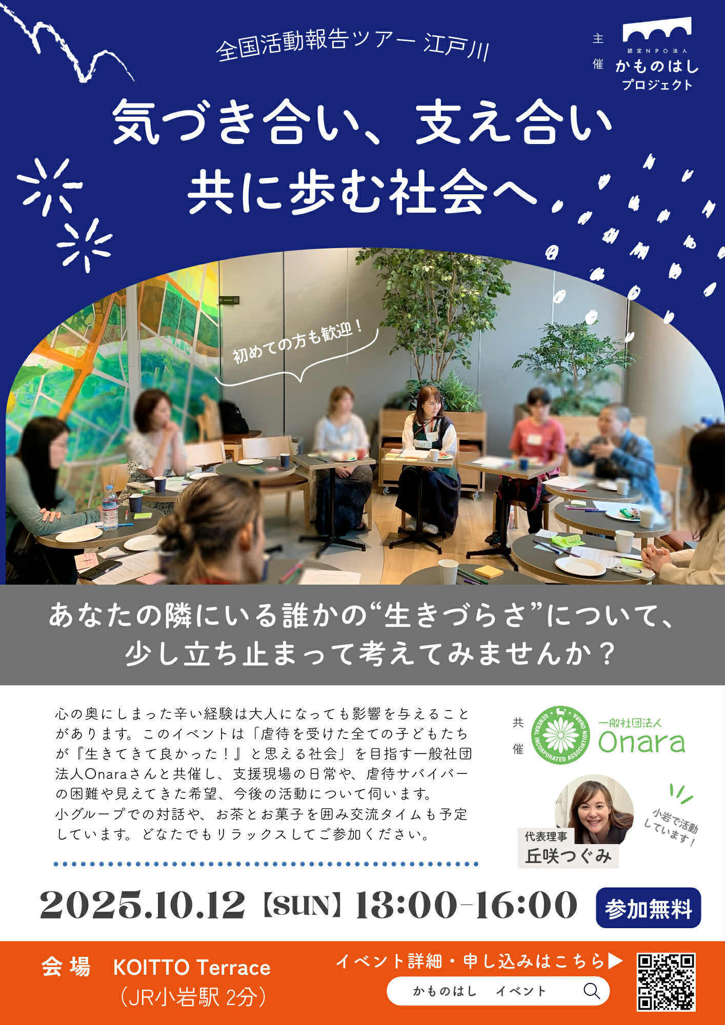 日時:10月12日(日)13:00〜16:00 会場:KOITTO TERRACE(JR小岩駅徒歩1分) 参加費:無料(定員30名)