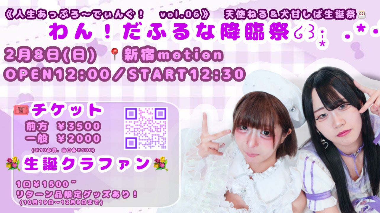 犬甘しばにとって初の生誕祭、天使ねる2度目の生誕祭が本人たちにとっても、お客様にとってもよりか輝かしい思い出となるようにスタッフ一同尽力して参ります。