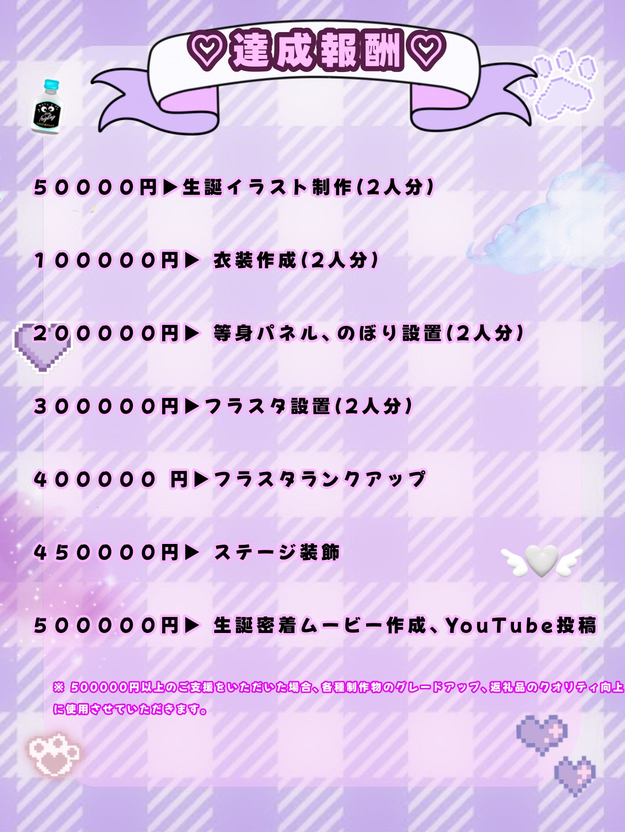 皆様からのご支援に応じて、フラワースタンドの設置やステージ、演出のグレードアップと生誕祭がより盛り上がるものになりますよう、企画運営させていただきますので何とぞよろしくお願いいたします。