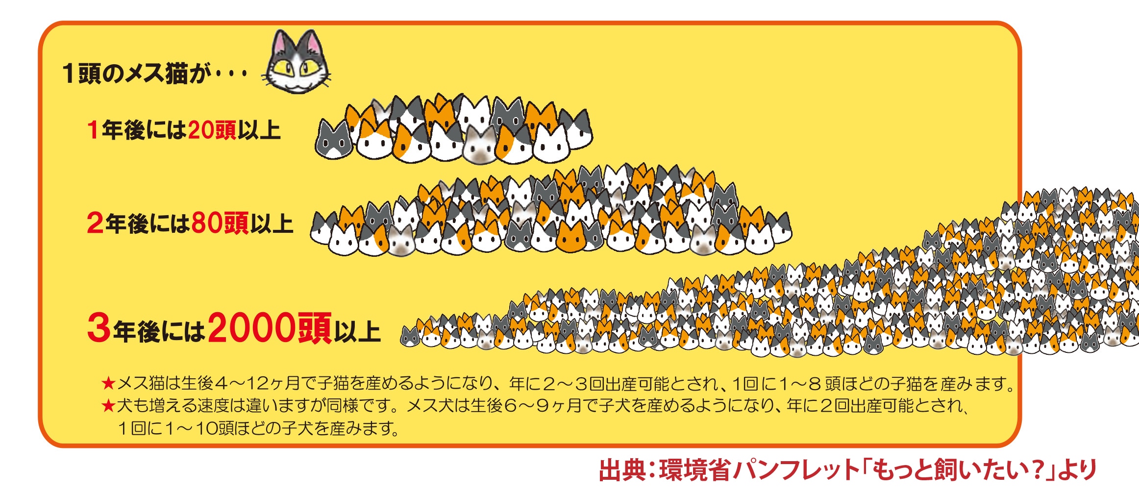 猫は繁殖力が強く、1年に2~4回、1回の出産で4~8匹の子猫を生むと言われています。環境省の試算では、1匹のメス猫から、1年後には20匹以上、2年後には80匹以上、3年後には2,000匹以上に繁殖するとされています。また、屋内で飼われる猫の平均寿命が10~15年であるのに対し、屋外で暮らす野良猫の寿命は、交通事故や猫同士の喧嘩によるケガや病気などで、半分以下の3~4年と言われています。