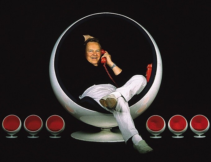 エーロ・アールニオ(1932- )は、家具デザインの分野で国際的に活躍する、フィンランドを代表するデザイナー。1960年代以降、繊維強化プラスチックなど新しい素材の探求に力を入れながら、曲線を主調とする斬新かつ遊び心のあるデザインを試みました。1963年にデザインされた《ボールチェア》は彼の代表作で、球体が宙に浮かぶような構造とポップな色彩を特徴としています。ユートピア的な近未来を予感させるこの椅子は、アメリカとソ連が宇宙開発を進めた1960年代において、宇宙旅行やSFに魅了された大衆の志向にも合致するものでした。