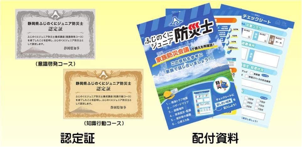コースにより講座内容は異なりますが、受講終了後に受講者全員が「家族で家庭内の防災対策について話し合った結果」等をレポートにまとめ県へ提出します。提出されたレポートを確認した上で「静岡県ふじのくにジュニア防災士」として認定し、児童・生徒一人ひとりに認定証(意識啓発コースまたは知識行動コース)を発行することで、防災への自覚を促します。