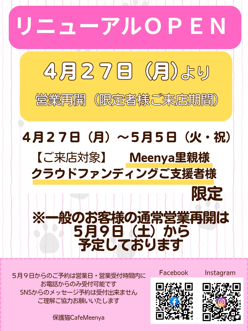 お陰さまで、本日より保護猫CafeMeenyaはリニューアルオープンいたします。