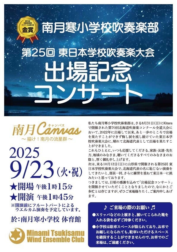 2026/02/27 12:00昨年は南月寒小学校吹奏楽部のクラウドファンディングに温かいご支援をいただき、誠にありがとうございました。皆さまからの応援に支えられ、部員たちは日々の練習や演奏活動に取り組むことができています。改めて心より感謝申し上げます。2026年も南月吹部は元気に活動を続けています!ソロコンテストでは札幌地区大会にて金賞を受賞、アンサンブルコンテストでは札幌地区大会・北海道大会ともに金賞を受賞するなど、部員たちは仲間とともに努力を重ね、大きく成長しています。また秋から冬にかけて新入部員も増え、現在は53名で活動しています。フレッシュな雰囲気の中で、音楽を楽しむ気持ちを大切にしながら日々練習に励んでいます。さて、この一年の集大成となる卒業演奏会のご案内をさせていただきます。6年生にとって最後の舞台であるとともに、これまで活動を支えてくださった皆さまへの感謝の気持ちを込めた演奏会でもあります。部員たちが一年間積み重ねてきた成果を、感謝の思いとともにお届けいたします。お時間がございましたらぜひご来場ください♪♪♪♪♪♪♪南月寒小学校吹奏楽部 卒業演奏会2026♪♪♪♪♪♪◆日付:3月8日(日)◆場所:南月寒小学校 体育館◆開場 9:30 / 開演 10:00◆入場無料※スリッパ等の上履きと外靴を入れる袋をご持参ください※駐車スペースがございませんので、お車での来場はご遠慮ください♪♪♪♪♪♪♪♪♪♪♪♪♪♪♪♪♪♪♪♪♪♪♪♪♪♪♪♪♪♪これからも南月寒小学校吹奏楽部の活動を温かく見守っていただけますと幸いです。今後とも応援のほど、どうぞよろしくお願いいたします。 もっと見るリターンについて&コンサートのお知らせ