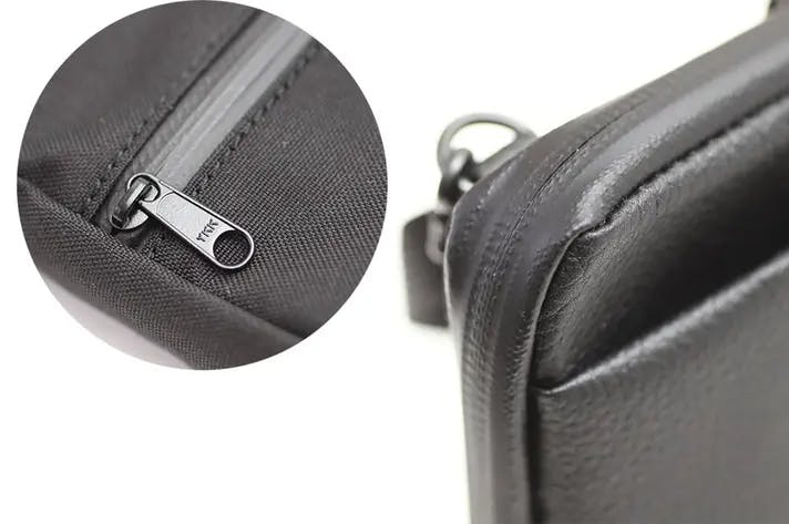 一般的な水に弱い革素材ではなく、「革×ナイロン」→「撥水レザー×撥水ポリエステル」にする事により、急な雨に負けないデザインに仕上げています。
