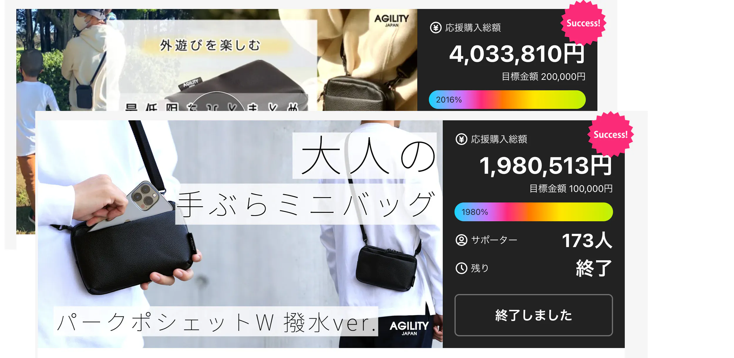 2025/10/23 09:28お世話になっております。AGILITYです。『パークポシェット撥水ver.』プロジェクトにご支援いただいております、キャンプファイヤーサポーターの皆様。お世話になっております。いよいよ募集期間の締め切りが、10月24日(金)23:59までとなります。10月納品間に合いますので、検討中のユーザー様は是非この機会によろしくお願いします。 -----【住所の確認・変更に関して】住所変更が必要な場合は、「10月26日(日) 23:59迄」に変更手続きをお願いいたします。システムの都合上、以降は住所変更が行えません。引っ越し、住所間違い等によりお荷物がお届けできない事象がございます。お手数ではございますが、配送先住所をご確認頂ければと思います。住所の変更に関しましては、下記手順になります。①プロフィール画面ご支援一覧ページを開く※https://camp-fire.jp/mypage/backers②『パークポシェット撥水ver.』プロジェクト『詳細を開く』をクリック③『お届け先』情報の確認・変更------ご不明点などございましたら、お気軽にお問い合わせください。今後ともAGILITYをよろしくお願いいたします もっと見る【感謝!!】第一目標達成 !!