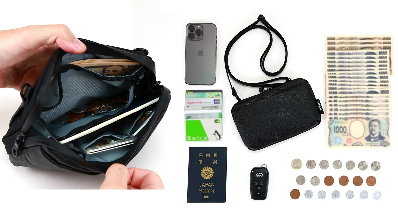 スマートフォン:1台 / お札:20枚 / 小銭:20枚 / カード:7枚 / スマートキー:1個 / パスポート:1冊