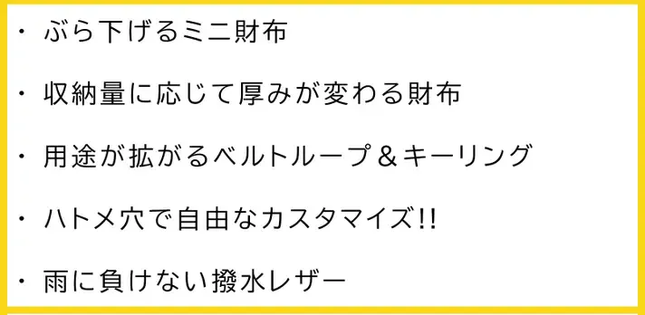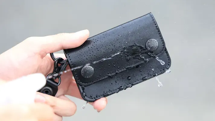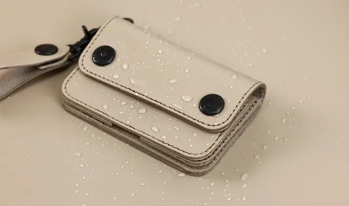 キャッシュレス化が進んでいることから、収納は最低限とし、素材は水に強い撥水レザーを選びました。様々なシーンでご利用いただけるシンプルな見た目が特徴です。