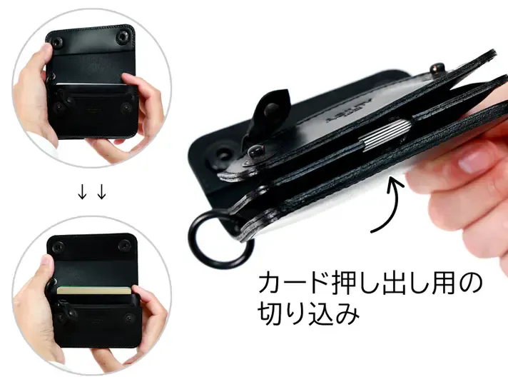 カードが取り出しにくいときは、カードポケット底面の切り込みを押すことでカードの頭がせり出します。