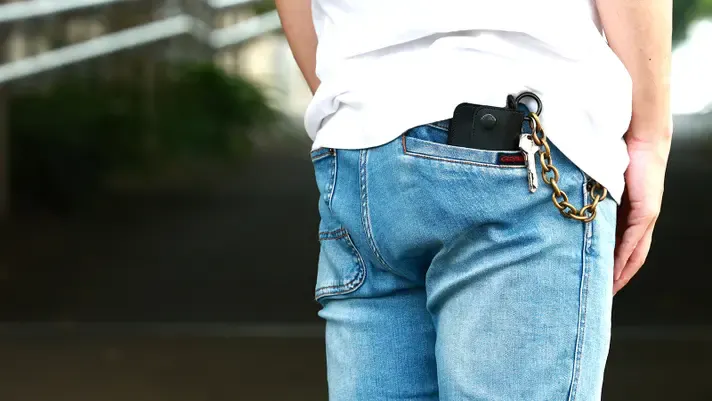 トラッカーウォレットといえば「ウォレットチェーン」が付属しており、パンツの後ろポケットに突っ込むのが一般的です。