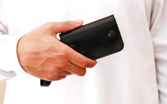 革は使い始めは固く、厚みがありますが使い込めば隙間がなくなりスリムな見た目に変身します。