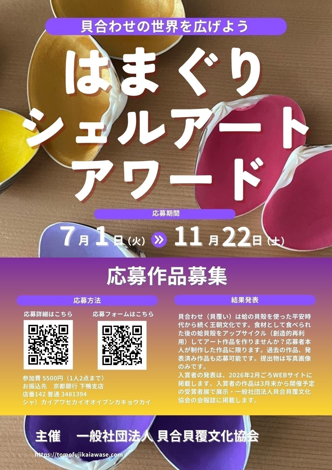 私たち、一般社団法人 貝合貝覆文化協会は平安時代の王朝文化「貝合わせ」に特化した協会です。今では正式な貝合わせの制作をする人はほとんどいなくなり、貝合わせの歴史文化は失われつつあります。私たちは、食べた後の蛤の貝殻を使用して(アップサイクル)貝合わせを制作していただく機会を作り、貝合わせ文化を後世に伝えるために「はまぐりシェルアートアワード」を企画しました。子供さんから絵や書を書かれる方まで多くの方に貝合わせの楽しみにを知っていただきたいです。