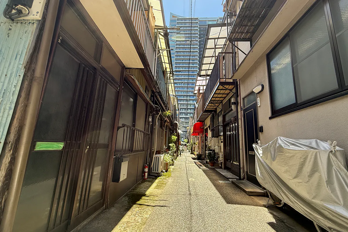 そして、その路地から空を見上げれば、最新のタワーマンションがそびえ立っている、新しいものと旧いものが混じり合う場所。